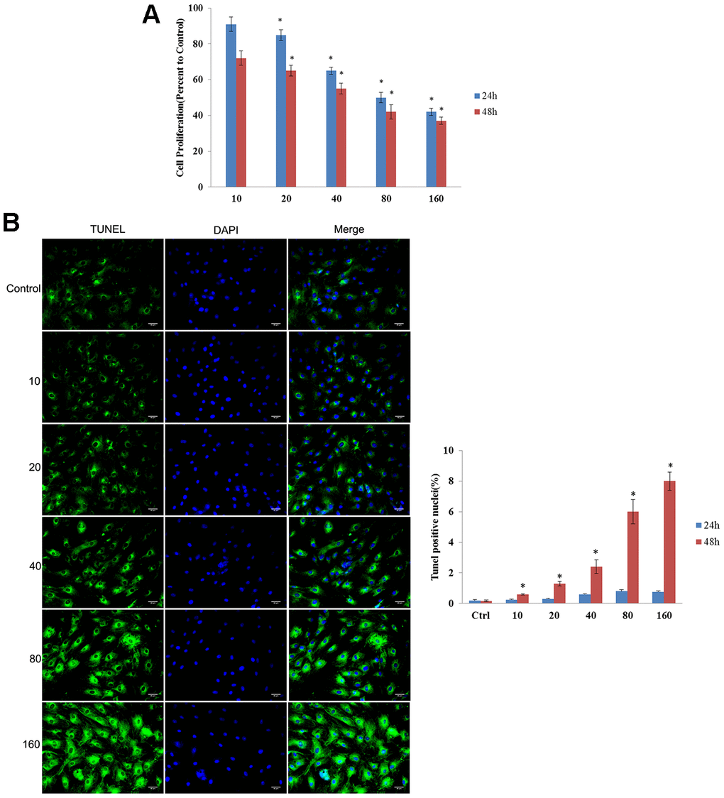 Cytotoxicity of CdSe/ZnS QDs was evaluated by MTT assay and TUNEL assay. MTT assay showed that CdSe/ZnS QDs treatment significantly inhibited cell viability of NRK cells in a dose-dependent manner both at 24 and 48 h (Figure 2A). Consistently, compared control cells, TUNEL-stained cells were obviously increased in a dose-dependent manner after NRK cells treated with CdSe/ZnS QDs both at 24 and 48 h (Figure 2B). These results suggested CdSe/ZnS QDs exhibited toxicity to NRK cells.