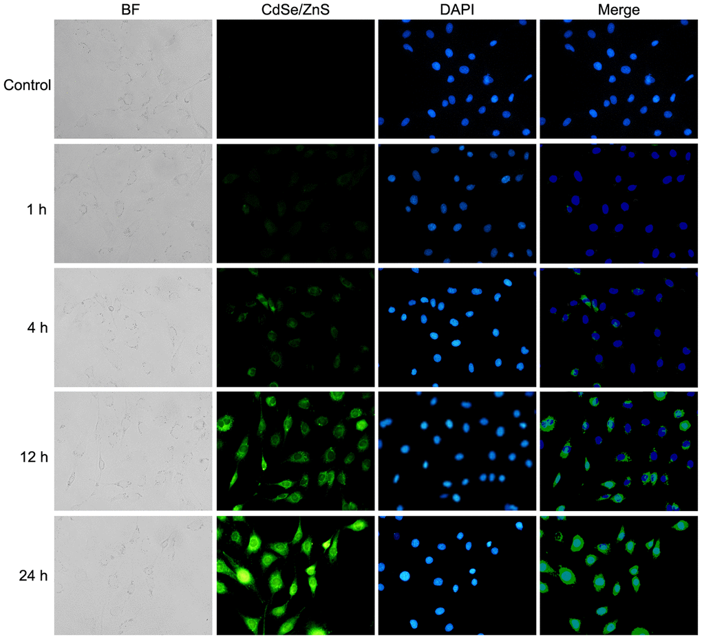 Cellular uptake of CdSe/ZnS QDs was evaluated using confocal imaging analysis. Briefly, NRK cells (2.5 × 104) were grown in 24-well plates for 24 h, and then incubated with 40 nM of CdSe/ZnS QDs for 1, 4, 12 and 24 h, respectively. After washed with PBS, cells were stained with Heochst33342 for 10 min, and then observed using confocal fluorescence microscope.