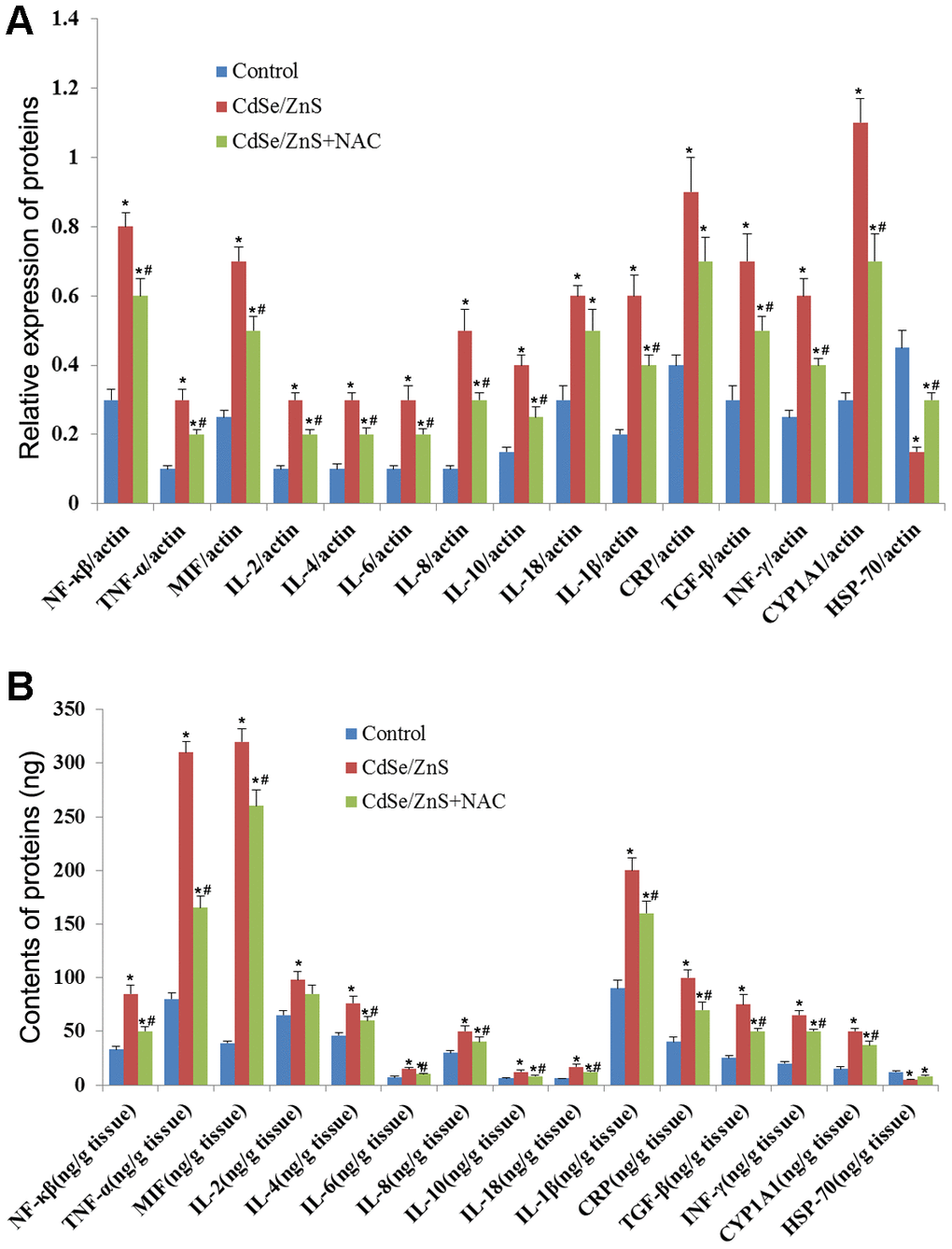 We also detected the expression of inflammatory cytokines to evaluate the toxicity of CdSe/ZnS QDs to kidney tissues of mice. qRT-PCR revealed that CdSe/ZnS QDs treatment conspicuously increased the mRNA levels of proinflammatory cytokines, including IL-1β, IL-2, IL-4, IL-18, IL-10, IL-8, IL-6, INF-γ, TGF-β, CRP, MIF, TNF-α, NF-kB, and CYP1A1, while decreased the mRNA level of HSP70 (p < 0.05, Figure 6A). However, the co-treatment of NAC and CdSe/ZnS QDs exhibited lower mRNA levels of proinflammatory cytokines, including IL-1β, IL-2, IL-4, IL-18, IL-10, IL-8, IL-6, INF-γ, TGF-β, CRP, MIF, TNF-α, NF-kB, and CYP1A1, as well as higher mRNA level of HSP70 compared with the single CdSe/ZnS QDs treatment (p < 0.05, Figure 6A). Similarly, ELISA results revealed that the protein expression of these inflammatory cytokines emerged the consistent expression trend compared with the results of qRT-PCR (Figure 6B).