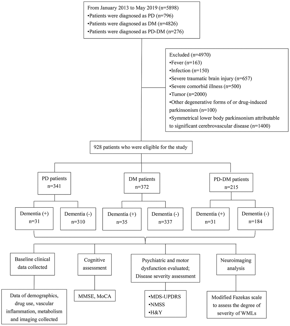 We recruited a total of 928 patients from outpatient clinics. A total of 215 PD-DM patients (including 31 PD-DM with dementia, PD-DMD), 341 PD patients without DM (including 31 PDD) and 372 DM patients without PD (including 35 DM with dementia, DMD) were included for this comparative study. PD patients without DM and DM patients without PD were set as controls. All PD and PD-DM patients underwent a standardized neurological examination by two movement disorder specialists in a blinded manner. The PD patients recruited in this present study (Figure 1) satisfied the 2015 Movement Disorder Society criteria for the diagnosis of idiopathic PD [36]. The diagnosis of DM was made by 2 physicians according to the following diagnostic criteria: a tested fasting glucose level higher than 7.0 mmol/L, a 2-h postprandial glucose level higher than 11.1 mmol/L, or pre-diagnosed type 2 diabetes [37]. Those who failed to meet the 2015 Movement Disorder Society criteria for PD or the diagnostic criteria for DM or were younger than 18 years (Figure 1) were excluded. Patients with fever (n=163), infection (n=150), severe traumatic brain injury (n=657), sever comorbid illness (n=500), tumor (n=2000) which might significantly impact movement and cognition, other degenerative forms of or drug-induced parkinsonism (n=100) and symmetrical lower body parkinsonism attributable to significant cerebrovascular disease (n=1400) were also excluded. Other information can be found in the Supplementary Files.