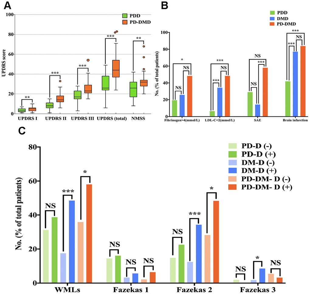 The potential vascular and inflammatory risk factors for dementia in PD, DM and PD-DM patients are summarized in Table 2A. We found that PD-DMD and DMD patients exhibited higher plasma levels of fibrinogen (>4g/L) and neutrophils, and more brain infarctions, SAE and WMLs (Fazekas 2), but lower levels of LDL-C (<2mmol/L) and lymphocytes, than PD-DM and DM patients without dementia (p<0.05), whereas no significant differences were noted in PD patients. Among all patients with dementia, PD-DMD and DMD patients exhibited more brain infarctions but lower levels of LDL-C (<2mmol/L) than PDD patients; PD-DMD patients exhibited higher levels of neutrophils and fibrinogen (>4g/L) but lower levels of lymphocytes than PDD patients. PD-DMD patients exhibited more SAE than DMD patients; DMD patients exhibited higher levels of hs-CRP (>3mg/L) than PDD patients (p<0.05) (Supplementary Table 2, Figure 2). However, there was no significant difference in blood pressure, BMI, WBC, or the incidence of smoking history, drinking history, or hyperlipidemia between patients (PD, DM and PD-DM patients) with dementia and those without dementia. There was no significant difference in the level of D-dimer or the proportion of WMLs among PDD, DMD and PD-DMD patients.