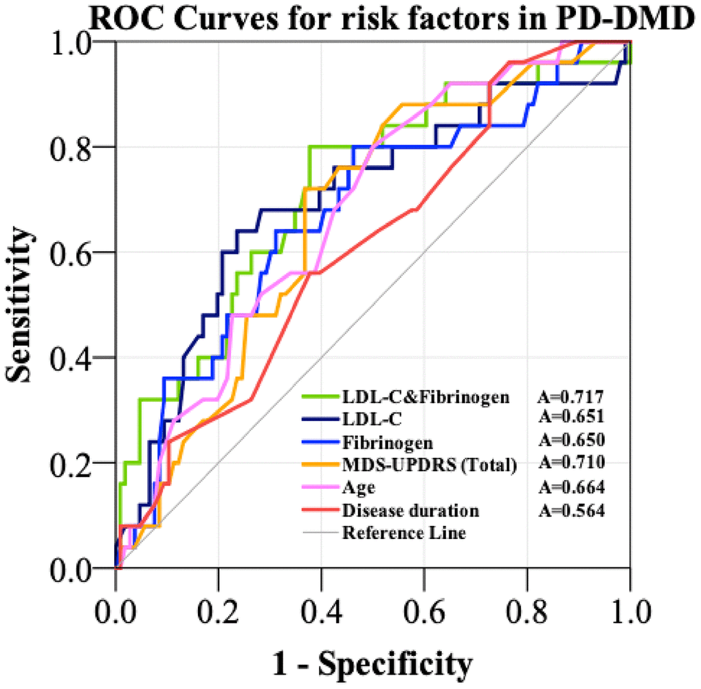 After selecting the potential risk factors including fibrinogen and LDL for dementia in PD-DM patients using logistic regression, we further explored their utility using ROC analysis to compare the discriminatory ability of predictors of dementia in PD-DM patients. Conventionally, it is accepted that the AUC in ROC analysis should be >0.7 to be of clinical value for screening. During the discovery phase, the AUC for the combination of fibrinogen and LDL-C proved to be better than using either alone (with the AUC increasing from 0.650 and 0.651 for either alone to 0.717, with a sensitivity of 80.0% and a specificity of 62.8%) or traditional diagnostic factors (disease duration, age, MDS-UPDRS) in the prediction of dementia.