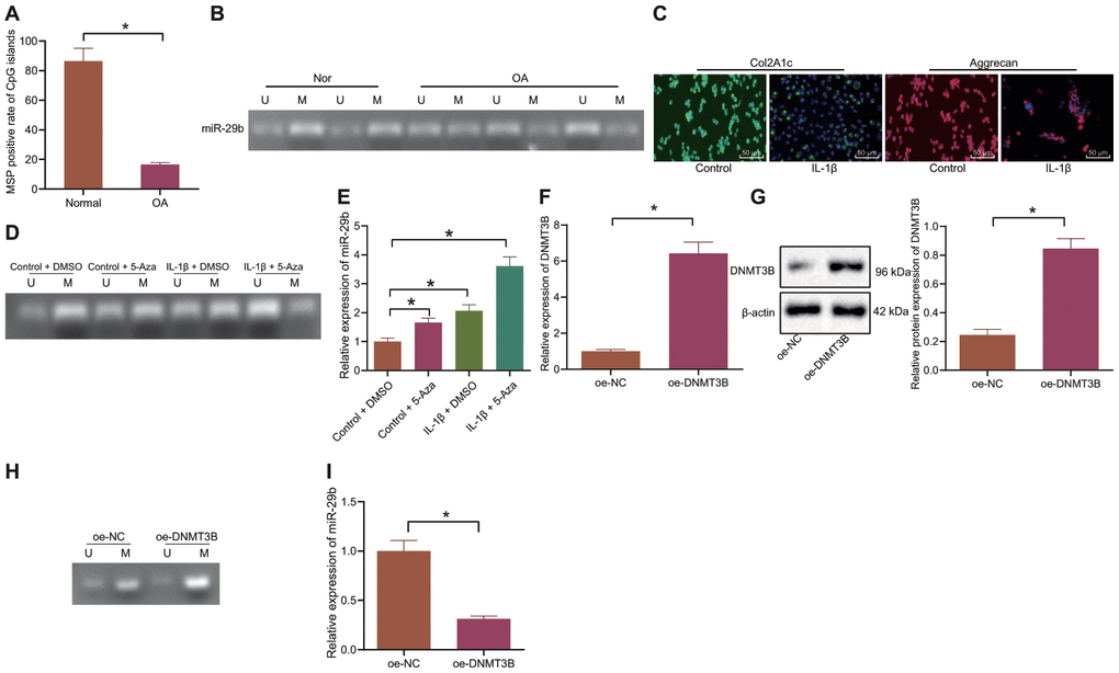 Following after, we isolated the normal chondrocytes which were subsequently treated with IL-1β to simulate the setting of OA chondrocytes. The cartilage markers, Col2A1 and Aggrecan were probed by the immunofluorescence staining and the results showed that the percentages of Col2A1 and Aggrecan positive cells treated with IL-1β were notably reduced (Figure 2C), implying the successful inducement of OA chondrocytes. Then, normal chondrocytes and IL-1β-treated chondrocytes were exposed to 5-Aza-2'-deoxycytidine (5-Aza) reagent (the DNA methylase inhibitor). The methylation of miR-29b was detected by MSP and its expression was determined by the RT-qPCR. Our results demonstrated that IL-1β treatment attenuated the methylation of miR-29b, thus upregulating its expression. Additionally, 5-Aza treatment also weakened the methylation of miR-29b and upregulated its expression (Figure 2D, 2E). The oe-DNMT3B plasmid was transfected into cells and RT-qPCR and Western blot analyses confirmed the successful transfection (Figure 2F, 2G). In the cells overexpressing DNMT3B, the methylation of miR-29b was promoted and its expression was remarkably reduced (Figure 2H, 2I). Collectively, these data indicated that DNMT3B could inhibit the expression of miR-29b by enhancing DNA methylation in the miR-29b promoter region.