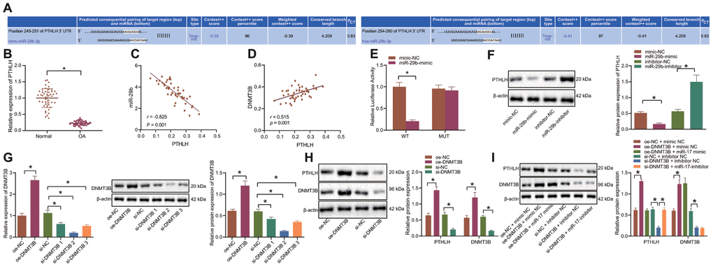 Recently, the expression profiles of 723 human microRNAs (miRNAs) have been identified from normal and OA chondrocytes, which may have important diagnostic and therapeutic potential in the context of OA [5]. For instance, miR-29b has been reported to be upregulated in the dedifferentiated OA chondrocytes that contribute to collagen imbalance related to an aberrant chondrocyte phenotype [6]. Interestingly, DNA methyltransferase 3B (DNMT3B) has been reported to participate in cartilage homeostasis as well as the onset and the progression of OA and can partially rescue the osteoarthritic phenotype as a putative therapeutic target [7]. Additionally, the interaction between miR-29b and DNMT3A contributes to DNA methylation-induced silencing of miR-29b [8]. Accordingly, it has been indicated that miR-29b-3p facilitates the chondrocyte apoptosis and OA development by targeting Progranulin [9]. Moreover, articular chondrocytes exhibit activated transcription factors such as parathyroid hormone-like hormone (PTHLH), that play an inhibitory role in terminal chondrocyte differentiation and endochondral bone formation [10]. In this study, the PTHLH was predicted to be a potential target of miR-29b. Thus, we anticipated that DNMT3B might mediate the methylation of miR-29b and its target gene PTHLH to affect the OA progression.