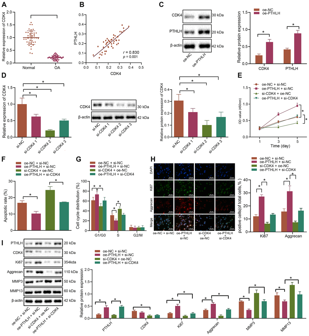 Thereafter, the potential regulatory role of PTHLH in the development of OA was investigated. RT-qPCR was performed to determine the expression of CDK4 in the cartilage tissues of OA patients and controls, and our results showed that CDK4 was poorly expressed in the cartilage tissues of patients with OA (Figure 4A). Furthermore, CDK4 was shown to be positively correlated with PTHLH expression (Figure 4B). The oe-PTHLH plasmid was introduced into chondrocytes and the quantification analysis results showed that PTHLH overexpression elevated the protein expression of CDK4 (Figure 4C). For CDK4 knockdown experiments, the siRNA targeting CDK4 with the best silencing efficacy was determined by RT-qPCR and Western blot analyses (Figure 4D), respectively. The in-vitro viability of IL-1β-treated chondrocytes assessed by MTT assay was significantly enhanced after overexpression of PTHLH (p < 0.05), however, this enhancement was blocked by co-transfection with si-CDK4 (p < 0.05; Figure 4E). Additionally, overexpression of PTHLH decreased the number of apoptotic IL-1β-treated chondrocytes as demonstrated by flow cytometry (p < 0.05), while the number of apoptotic cells was remarkably increased by CDK4 silencing (p < 0.05); on the other hand, the inhibition of apoptosis by oe-PTHLH was partially counteracted by si-CDK4 (Figure 4F). Consistently, flow cytometric analysis also demonstrated that the silencing of CDK4 induced G1 cell cycle arrest and notably decreased the number of S-phase cells in IL-1β-treated chondrocytes (p < 0.05). On contrary, overexpression of PTHLH led to increased number of cells in the S-phase, indicative of cell cycle progression (Figure 4G). The expression of Ki67 and Aggrecan in IL-1β-treated chondrocytes was detected by the immunofluorescence, and the percentages of Ki67 and Aggrecan positive cells were increased by the overexpression of PTHLH; however, this increase was alleviated by additional transfection with si-CDK4 (Figure 4H). Consistently, results from Western blot analysis also exhibited that the protein expression of Ki67 and Aggrecan was elevated, while the expression of ECM markers MMP3 and MMP13 was downregulated in IL-1β-treated chondrocytes by overexpression of PTHLH. However, the silencing of CDK4 partially inhibited the increase of Ki67 and Aggrecan and the decline of ECM markers which were induced by PTHLH overexpression (Figure 4I). Collectively, these aforementioned-results suggested that PTHLH could accelerate the viability of IL-1β-treated chondrocytes and hinder their apoptosis in OA in a CDK4-dependent manner.