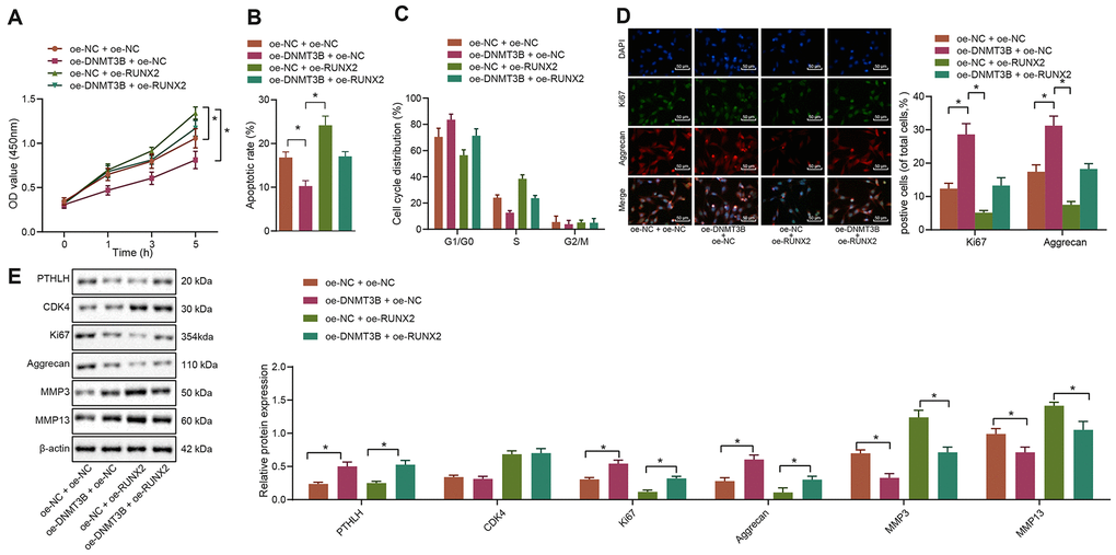 To further investigate whether DNMT3B was involved in the regulation of RUNX2 in IL-1β-treated chondrocytes, both RUNX2 and DNMT3B were overexpressed in chondrocytes either in combination or alone. The MTT assay demonstrated that overexpression of DNMT3B remarkably promoted the in-vitro viability of IL-1β-treated chondrocytes (p < 0.05) while overexpression of RUNX2 noticeably inhibited their viability (p < 0.05). Furthermore, overexpression of RUNX2 neutralized the enhancement of IL-1β-treated chondrocyte viability caused by DNMT3B overexpression (Figure 6A). Additionally, flow cytometric data suggested that overexpression of DNMT3B inhibited the apoptosis of IL-1β-treated chondrocytes while overexpression of RUNX2 enhanced their apoptosis (p < 0.05). Overexpression of RUNX2 attenuated the suppression of apoptosis induced by DNMT3B overexpression (Figure 6B). Meanwhile, overexpression of RUNX2 induced G1 cell cycle arrest and decreased the cells at S phase in IL-1β-treated chondrocytes (p < 0.05). The upregulation of DNMT3B, conversely, resulted in increased cells in S-phase and promoted cell cycle progression (Figure 6C). The results from immunofluorescence assay further revealed that the percentages of Ki67 and Aggrecan positive cells were increased in IL-1β-treated chondrocytes by overexpression of DNMT3B but were reduced by overexpression of RUNX2 (Figure 6D). Besides, Western blot analysis exhibited that the protein expression of Ki67 and Aggrecan was increased while the expression of ECM markers MMP3 and MMP13 was downregulated in IL-1β-treated chondrocytes following oe-DNMT3B delivery. Moreover, overexpression of RUNX2 reversed the increase of Ki67 and Aggrecan and the downregulation of ECM markers that were induced by DNMT3B (Figure 6E). Hence, these above-described results collectively indicated that RUNX2 could alleviate the effects of DNMT3B on IL-1β-treated chondrocytes.