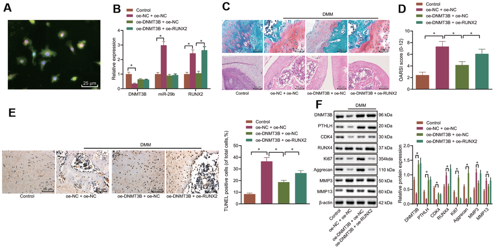 The mouse model of OA was induced by the DMM and lentivirus vector harboring oe-DNMT3B and/or oe-RUNX2 were injected into mice intraarticularly. After 8 weeks, the mice were euthanized and the cartilage tissues were collected from their hind limbs. Immunofluorescence was performed to detect the co-localization of DNMT3B and collagen II in the cartilage tissues (Figure 7A), and results revealed that DNMT3B and collagen II were both localized in the cartilage tissues. The expression of DNMT3B, miR-29b, and RUNX2 in the collected cartilage tissues was determined by the RT-qPCR (Figure 7B), followed by histological analyses. The results of Safranin O and HE staining (Figure 7C) showed that the surface of the knee cartilage (red) of the sham-operated mice was smooth. In DMM-operated mice, severe destruction, erosion, and lesions of articular cartilage, a remarkable reduction of chondrocytes, as well as the enormous loss of proteoglycan, were observed. However, the upregulation of DNMT3B ameliorated the loss of chondrocytes and proteoglycan in the DMM-operated mice. Nevertheless, oe-RUNX2 reversed the ameliorative effect of oe-DNMT3B on the loss of chondrocytes and proteoglycan. Meanwhile, OARSI scoring presented consistent results with histological analysis (Figure 7D). OARSI score of the DMM-operated mice was markedly increased compared with the sham-operated mice, while overexpression of DNMT3B reduced the OARSI score of the DMM-operated mice. The cell apoptosis in cartilage tissues shown by TUNEL staining was enhanced in the DMM-operated mice, which was inhibited by the upregulation of DNMT3B whereas RUNX2 overexpression partially counteracted the anti-apoptotic effect of DNMT3B (Figure 7E). Results from Western blot analysis demonstrated that overexpression of DNMT3B resulted in reduced expression of RUNX2, MMP3, and MMP13 in cartilage tissues, and potentiated expression of PTHLH, CDK4, Ki67, and Aggrecan. On the contrary, RUNX2 overexpression reversed the changes in the above-mentioned proteins caused by DNMT3B overexpression (Figure 7F). Hence, these data suggested that DNMT3B exerted an anti-apoptotic function in-vivo by reducing RUNX2, which was consistent with our in-vitro findings.
