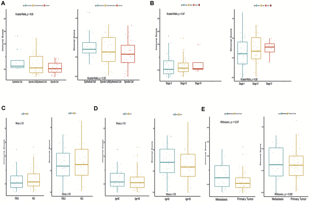 To the best of our knowledge, this is the first study to investigate the UM tumor microenvironment using the ESTIMATE algorithm based on large public datasets, developing and validating the contribution of one stromal and three immune cells signatures in UM prognosis. Our prognostic signature can further stratify clinically defined groups of patients (eg, age, stages I, II, III and IV UM, histological type) into subgroups with different risk analysis (Figure 6).