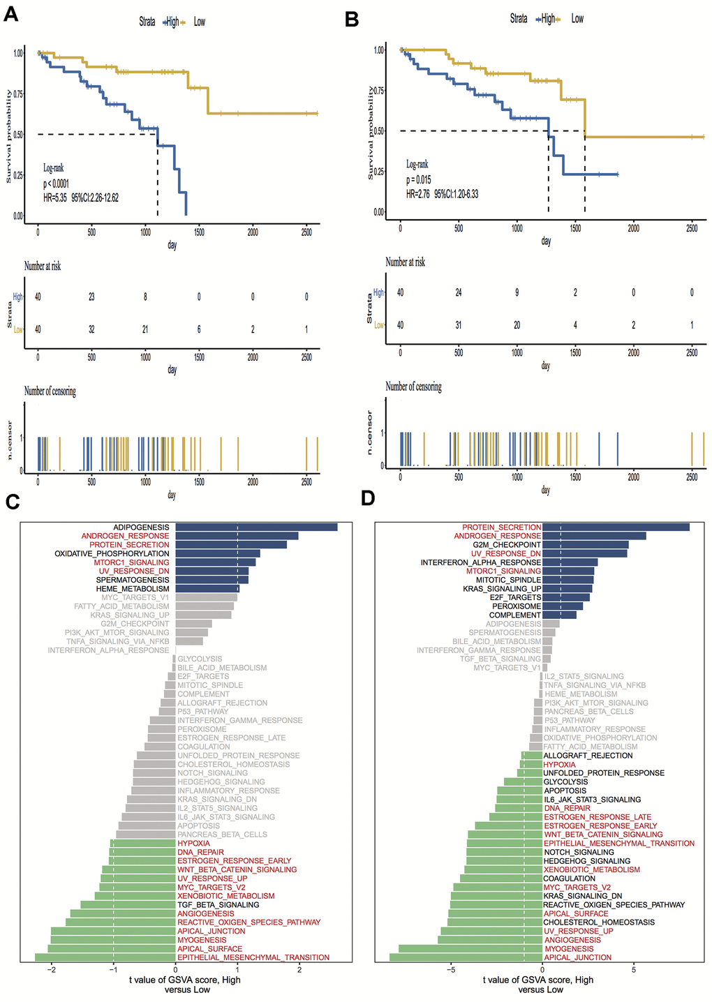 To investigate the hallmark pathways shared by different immune or stromal groups, we performed gene set variation analysis (GSVA). According to the following criteria of P value < 0.05 and |GSVA score| ≥ 1, four hallmark terms were commonly differently expressed in the high immune and stromal score group, and 12 hallmark terms were commonly differently regulated in the low immune and stromal score group. The same pathways are marked in red in Figure 2C, 2D.