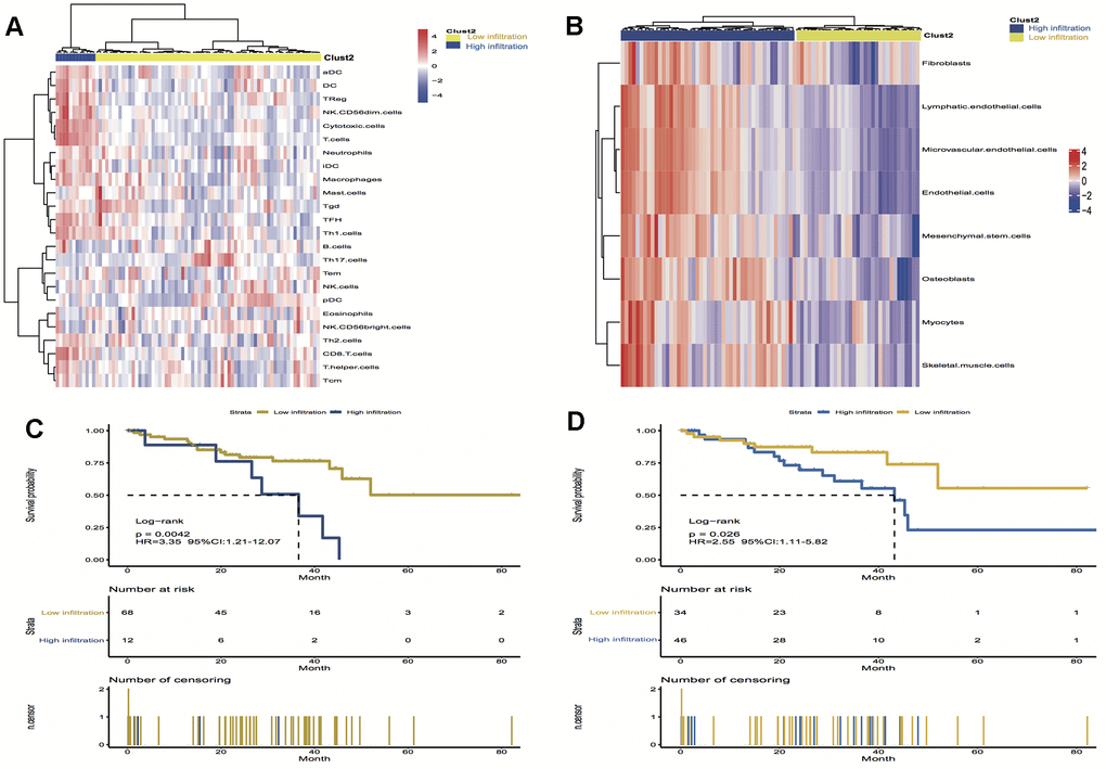 To validate the above findings, the immune and stromal cells phenotypes expression profiles from UM were optimally clustered by applying the “ClassDiscovery” algorithm and the results are shown in Figures 3A, 3B. Cell infiltration in immune and stromal subtypes showed that the overall survival of the high infiltration group is significantly shorter than the low infiltration group (HR, 3.35; P = 0.004; and HR, 2.55; P = 0.03, respectively; Figure 3C, 3D).