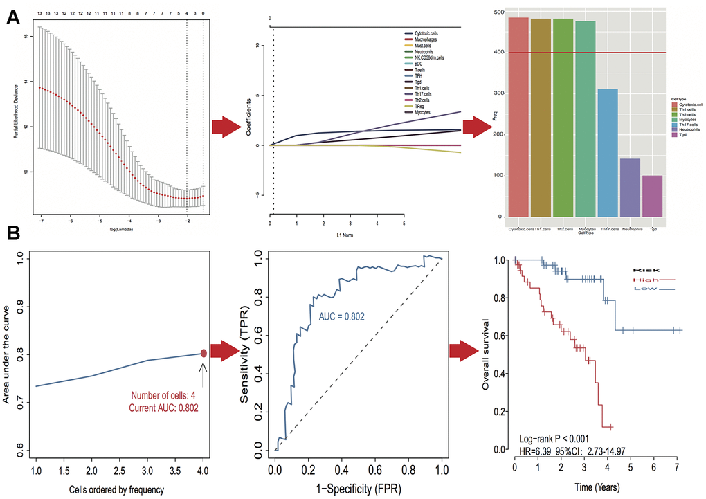 The survival-related cells in primary selection are not suitable for clinical diagnosis. Therefore, a robust survival modeling approach was used to identify suitable cell signature. We constructed prognostic models by using the “lasso” package and ran the analysis for 500 iterations. Statistical stability under each model was evaluated and a frequency greater than 400 regarded as indicating a stable model. Kaplan–Meier survival curves were plotted and differences between the subgroups were compared using log-rank tests. Receiver operating characteristic curves [1] were drawn for the predicted 3-year overall survival (OS), and the AUC values was used to evaluate the specificity and sensitivity of the cell signature. Moreover, to prove the reliability of the result, this cell signature was further validated in another two independent datasets (GSE44295 and GSE84976).