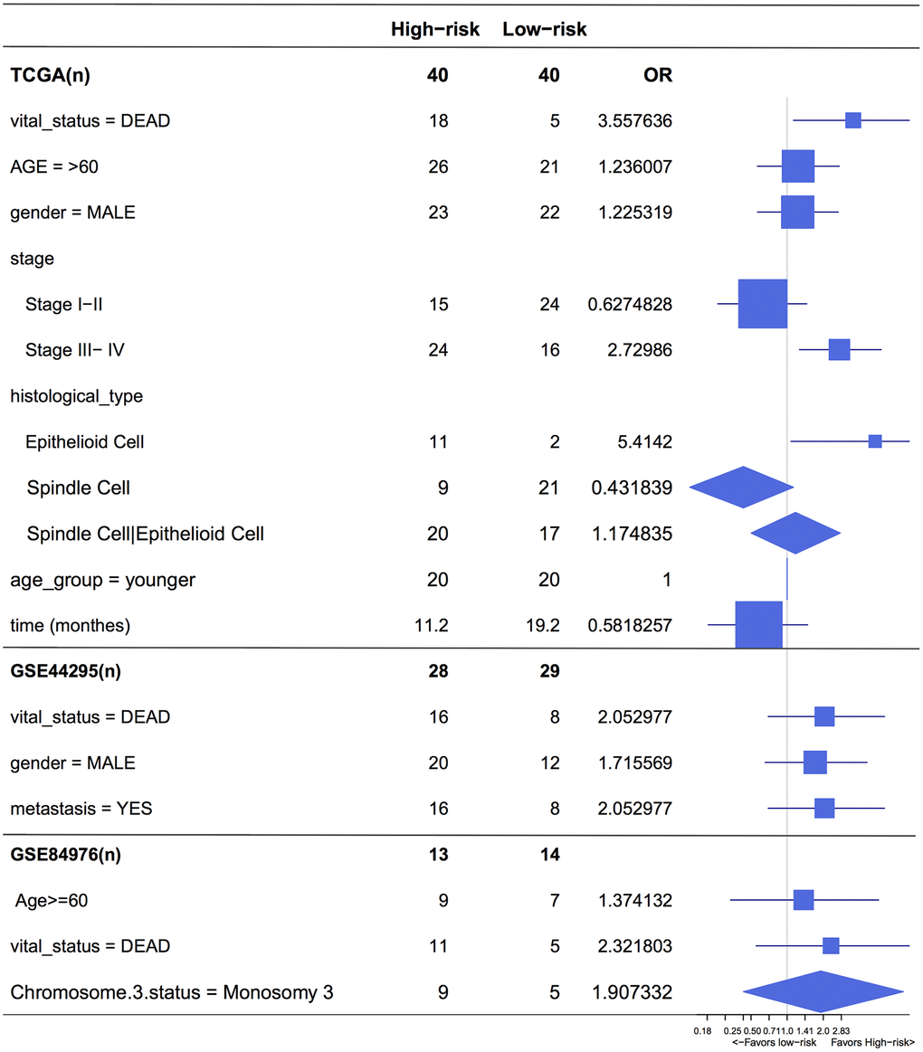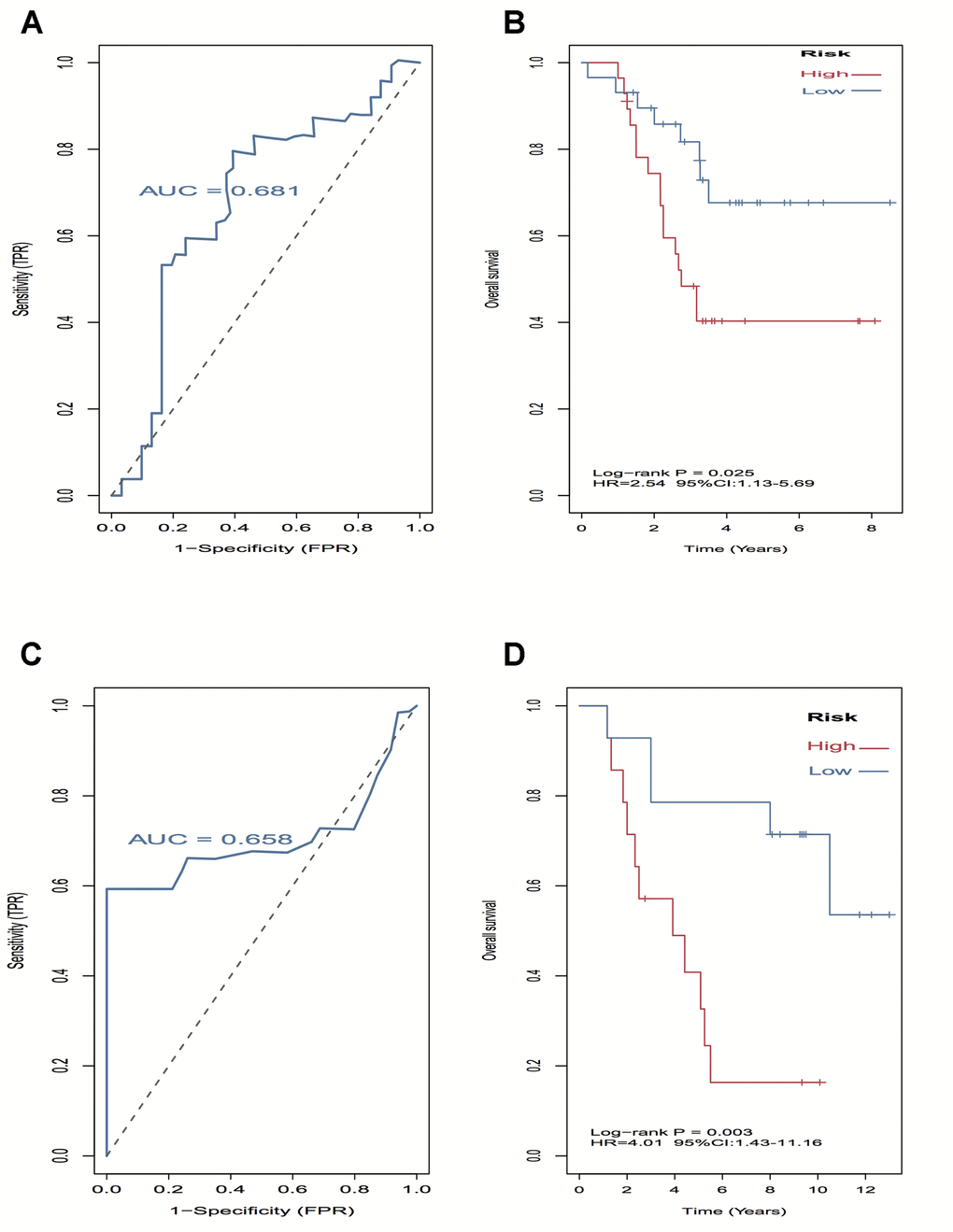 A log-rank test of Kaplan-Meier survival curves of 24 immune cells and 11 stromal cells showed that there was a total of 13 immune cells and 1 stromal cell capable of significantly predicting poor overall survival rate (P < 0.05). Moreover, we used LASSO modeling with 500 iterations to evaluate associations between the 14 selected cells and overall survival in the TCGA dataset. Finally, a four-cell (cytotoxic cells, Th1 cells, Th2 cells and myocytes cells) biomarker was screened out of the 14 selected cells to build a risk signature based on the criteria (Figure 4A). The risk score formula for overall survival was calculated as follows: risk score = 1.54 × (expression value of Cytotoxic cells) + 1.20 × (expression value of Th1 cells) + 2.80 × (expression value of Th2 cells) - 0.46× (expression value of Myocytes). The risk system calculates a risk score for each patient. Applying the median cut-off value of the risk scores, 80 patients with UM were divided into high-risk and low-risk groups. Kaplan-Meier curve indicated that there was a significant difference between high-risk and low-risk group (HR, 6.39; 95% confidence interval (CI), 2.73 to 14.97; P < 0.001) (Figure 4B). The area under the curve (AUC) values for the four-cell model was 0.802. To verify the predictive ability of the four-cell model, validation analysis was performed using the GSE44295 and GSE84976 datasets. The AUC values of four cells were 0.681 and 0.658, respectively (Figure 5A, 5C). The Kaplan-Meier curve revealed that the low-risk group have a significantly better survival than the patients in high-risk group with log-rank test (HR, 2.54; P = 0.03 and HR, 4.01; P = 0.003, respectively) (Figure 5B, 5D). Results of the subgroup analysis of clinical characteristics of low- and high- risk groups are shown in Figure 6.