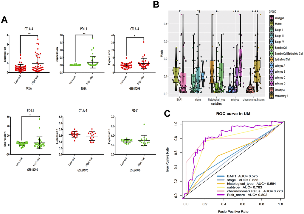 All the three datasets showed that the correlation of CTLA-4 and PD-L1 expression with the low-risk group is significantly less than that of the high-risk groups. Thus, we were interested in investigating the response to treatment. It has been reported that the primary targets of immune checkpoint blockade (ICB) treatment are PD-1 and CTLA4 [25]. Previous studies have clarified that the success of anti-PD-1 and anti-CTLA-4 agents in UM has been much more limited [26–27]. Some of our results are consistent with the previous studies, but an interesting point is that the high-risk group is more responsive to anti-PD-1 therapy and several chemotherapeutic drugs. Furthermore, we checked several more drugs like mitomycin C and lapatinib, which could also be used as supplementary or combined treatment agents [28]. However, more benchwork and clinical studies are needed to further validation. As aforementioned, we first developed the prognostic model and calculated the risk score. It would be more helpful to identify patients at high-risk in clinic and attempt the sensitive immunotherapy and chemo-treatment.
