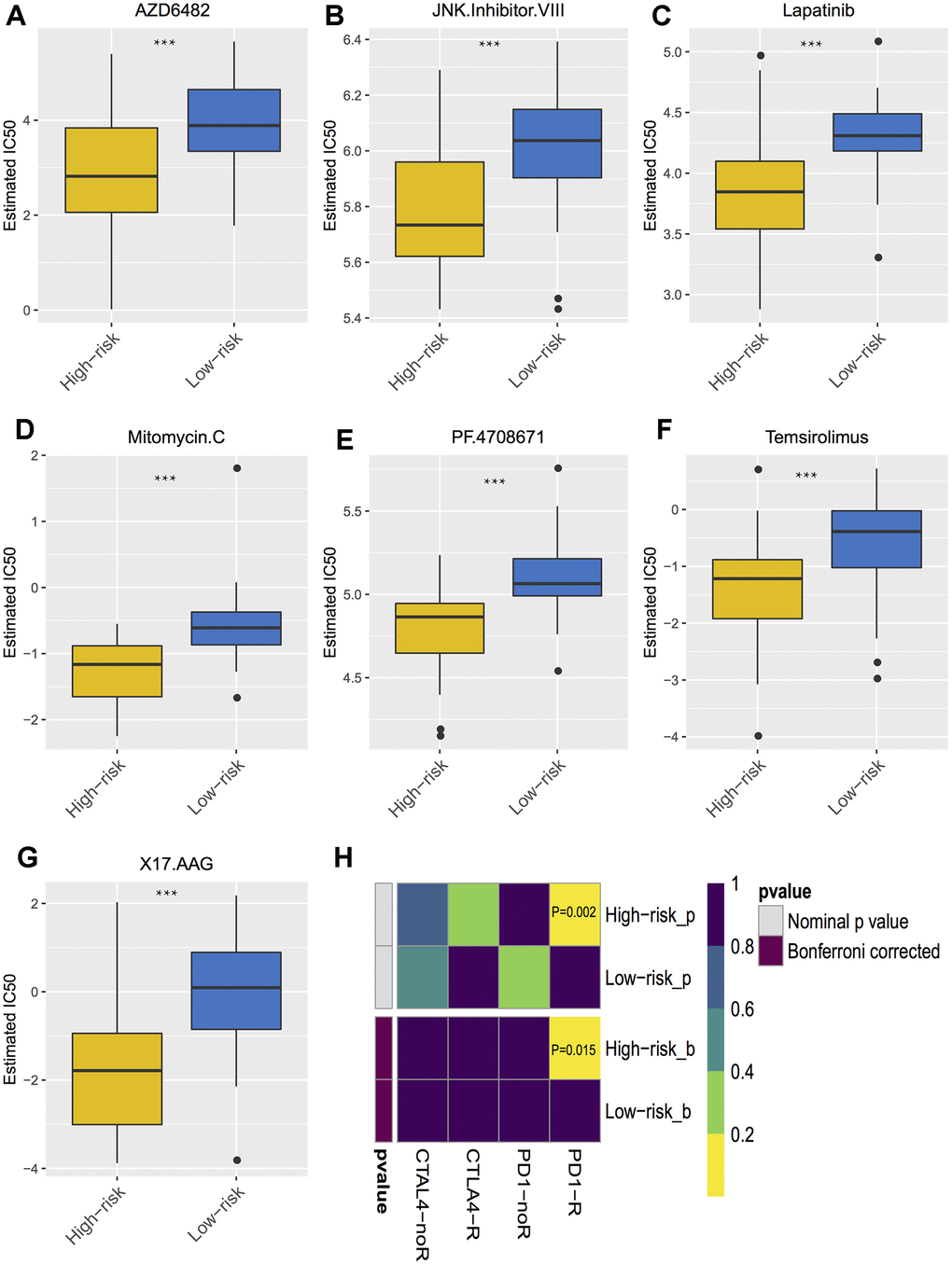 The correlations of cytotoxic T-lymphocyte-associated protein 4 (CTLA-4) and programmed death-ligand 1 (PD-L1) expression with low- and high- risk groups were analyzed. The results revealed that the expression in the high-risk group was generally higher than that in the low-risk group (Figure 7A). The relationships between risk score and previously established prognostic markers, such as tumor stage, chromosome 3 status, mutated BAP1 and molecular subtype, were explored. The box plots in Figure 7B show that BAP1 mutant, subtype D, and monosomy 3 have a higher risk score than BAP1 wildtype, subtype A and disomy 3, respectively. Compared with the 3 years AUC values of these established prognostic markers (BAP1 mutant, tumor stage, histological type, subtype and chromosome 3 status), our signature can achieve higher accuracy value (Figure 7C). Furthermore, we used subclass mapping to compare the expression profile of the two subgroups and another dataset containing details of 47 patients with cutaneous melanoma that responded to immunotherapies, published in the TIDE website. Interestingly, we found that the high-risk group is more promising to respond to anti-PD-1 therapy (Bonferroni corrected P = 0.02) (Figure 8H). To further explore the response to chemotherapy between high- and low-risk patients with UM, we performed “pRRophetic” algorithm to estimate the chemotherapeutic response based on half maximal inhibitory concentration (IC50) available in the Genomics of Drug Sensitivity in Cancer (GDSC) database. Seven chemotherapeutic drugs, including AZD6482, JNK Inhibitor VIII, Lapatinib, Mitomycin C, PF.4708671, Temsirolimus and X17.AAG were identified as producing significant differences in the estimated IC50 between the high- and low-risk groups. Remarkably, we observed from the estimated IC50 of these chemotherapeutic drugs, that the high-risk group could be more sensitive to chemotherapies than those in low-risk group. (Figure 8A–8G).