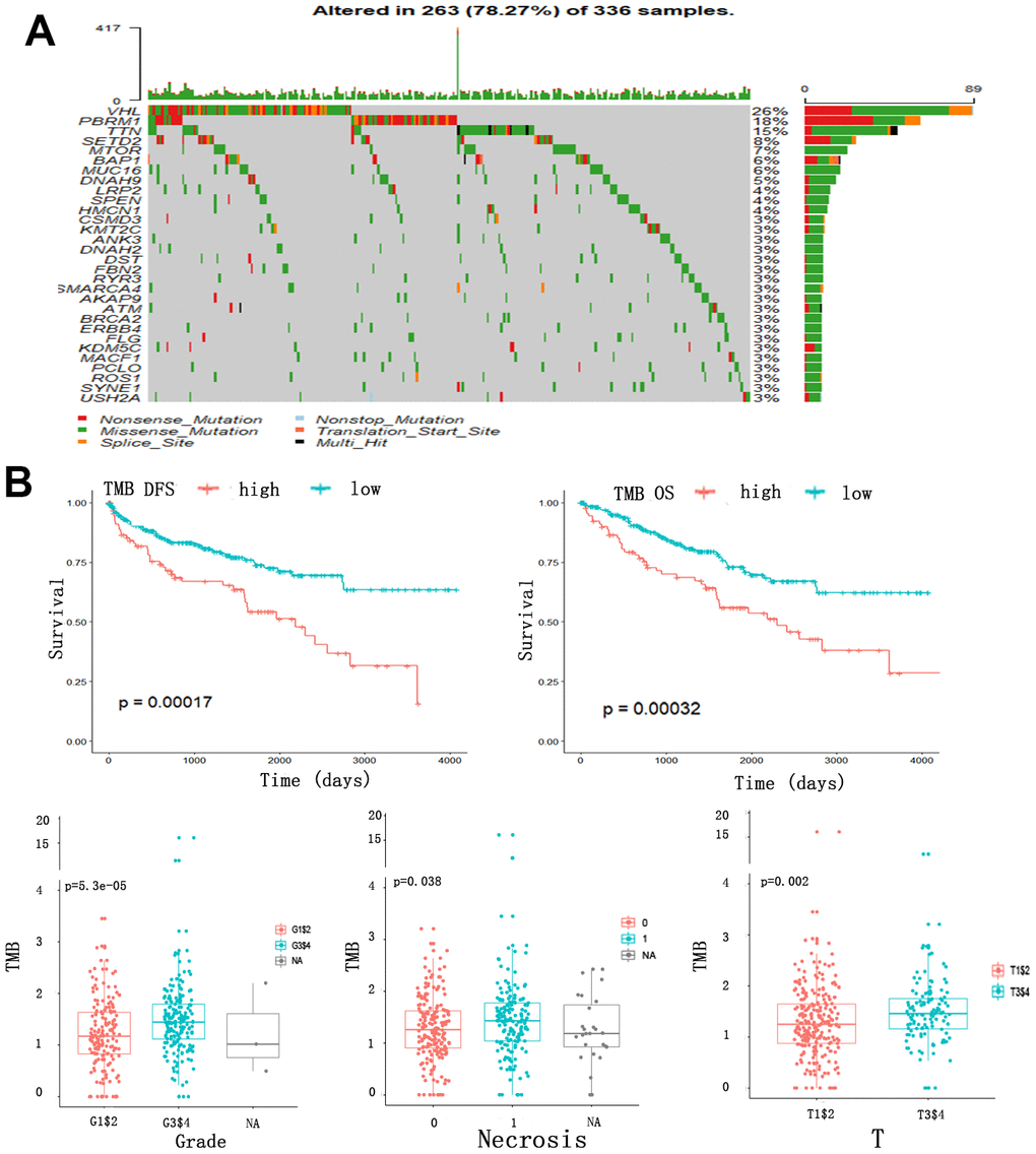 We analyzed the somatic mutations in ccRCC patients from TCGA cohort and identified 30 frequently mutated genes (Figure 1A). The genes and percentages of patients carrying the mutations are as follows: VHL (26%), PBRM1 (18%), TTN (15%), SETD2 (8%), MTOR (7%), BAP1 (6%), MUC16 (6%), DNAH9 (5%), LRP2 (4%), SPEN (4%), HMCN1 (4%), CSMD3 (3%), KMT2C (3%), ANK3 (3%), DNAH2 (3%), DST(3%), FBN2 (3%), RYR3 (3%), MARCA4 (3%), AKAP9 (3%), ATM (3%), BRCA2 (3%), ERBB4 (3%), FLG (3%), KDM5C (3%), MACF1 (3%), PCLO (3%), ROS1 (3%), SYNE1 (3%), USH2A (3%). We also evaluated the correlation between TMB and clinical outcomes using data collected from Cbioportal datasets. The TMB scores across all samples ranged from 0 to 16.05157. After constructing an X-tile plot of TMB and overall survival (OS), a TMB score cutoff of 1.7 was used to divide patients into TMB-low and TMB-high subsets. In contrast to findings from earlier studies of other cancers [22, 23], ccRCC patients in TMB-high had poorer clinical outcomes, irrespective of their disease-free survival (DFS) (p=0.00017) or OS (p=0.00032) status. At the same time, a higher TMB indicated a higher tumor grade (p<0.0001), higher risk of necrosis (p=0.038), and higher T staging (p=0.002) (Figure 1B).