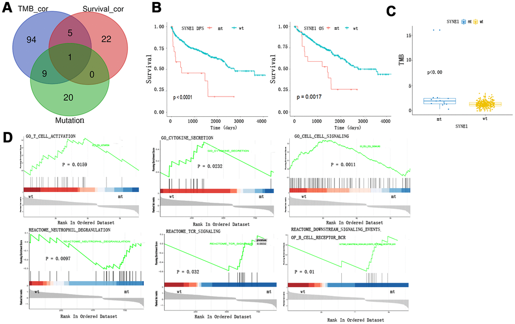 We detected the SYNE1 mutation in a Venn diagram at the intersection of the top 30 somatic mutations, survival-related mutations, and TMB-related mutations in ccRCC (Figure 2A). Patients with SYNE1 mutation (mt) had poorer survival outcomes, irrespective of DFS (p<0.0001) or OS (p=0.0017) status (Figure 2B). In addition, a higher TMB correlated with SYNE1 mutation (p<0.0001) (Figure 2C). This is consistent with our previous analysis of TMB and clinical outcomes. COX survival analysis revealed that SYNE1 mutation was a risk factor affecting prognosis (HR=0.978; 95% CI, 1.156-6.114; P=0.021). In a multivariate analysis, however, SYNE1 mutation did not remain a significant factor affecting prognosis (Table 1), suggesting SYNE1 mutation may not be an independent risk factor affecting prognosis in ccRCC patients. GSEA results revealed that pathways including GO T cell activation, GO cytokine secretion, GO cell-cell signaling, Reactome neutrophil degranulation, Reactome TCR signaling, and Reactome downstream signaling events of B cell receptor are involved (Figure 2D).