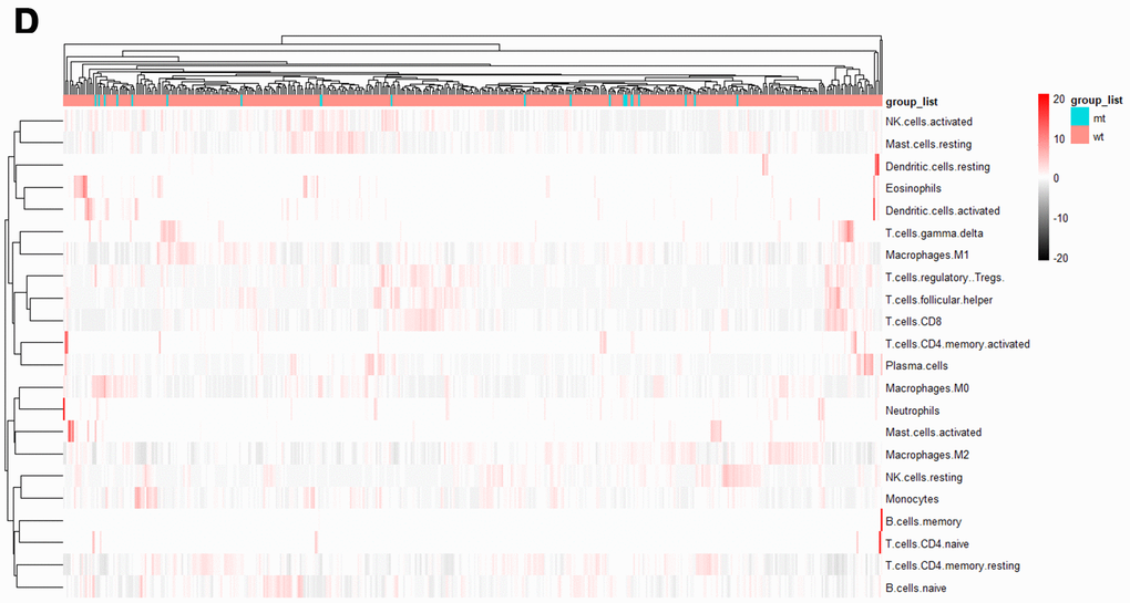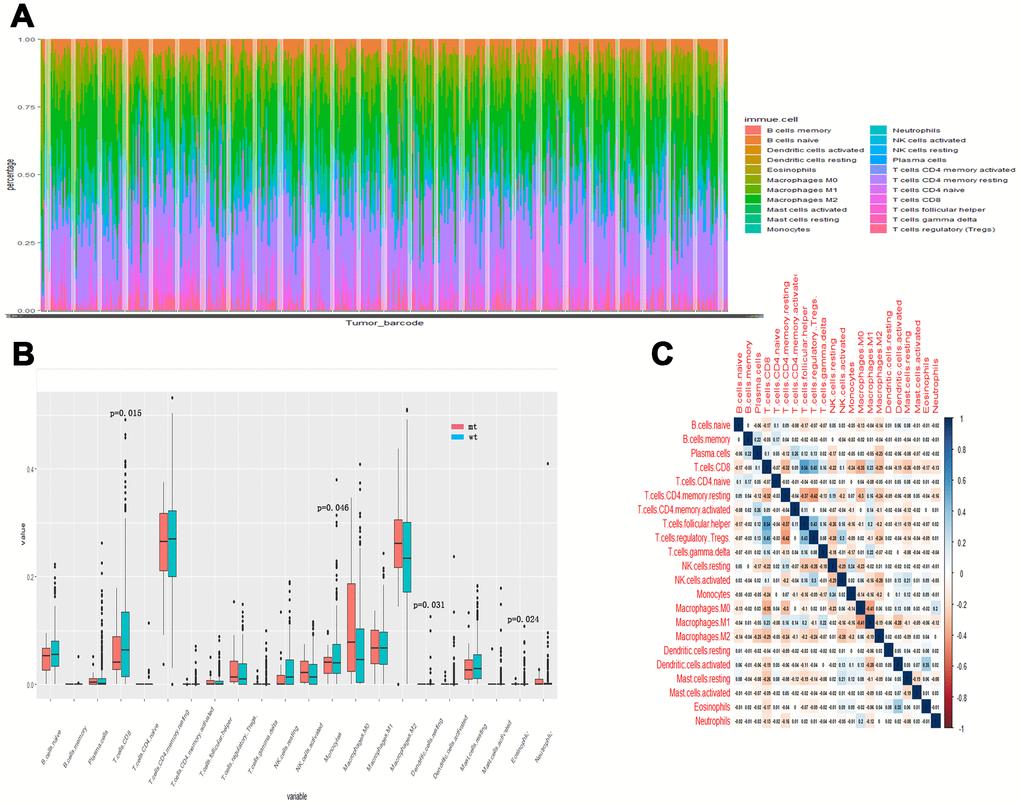 To further compare the differential profiles of immune fractions between SYNE1 mt and wt groups, we used the CIBERSORT algorithm to evaluate the association between SYNE1 mutation and tumor-infiltrating immune cells. Twenty-two immune cell types in each ccRCC sample are shown in the boxplot in Figure 3A. We found that numbers of CD8 T cells (p=0.015), monocytes (p=0.046), resting dendritic cells (p=0.031), and eosinophils (p=0.024) were lower in the SYNE1 mt group than in the wt group (Figure 3B). Using a correlation matrix, we found that numbers of CD8 T cells correlated positively with follicular helper T (TH) cells, regulatory T cells (Tregs) and M1 macrophages, while they correlated negatively with CD4 T cells, resting memory T cells, and M0 macrophages (Figure 3C). The heatmap shows that immune cell fractions were lower in the mt group than wt group (Figure 3D).