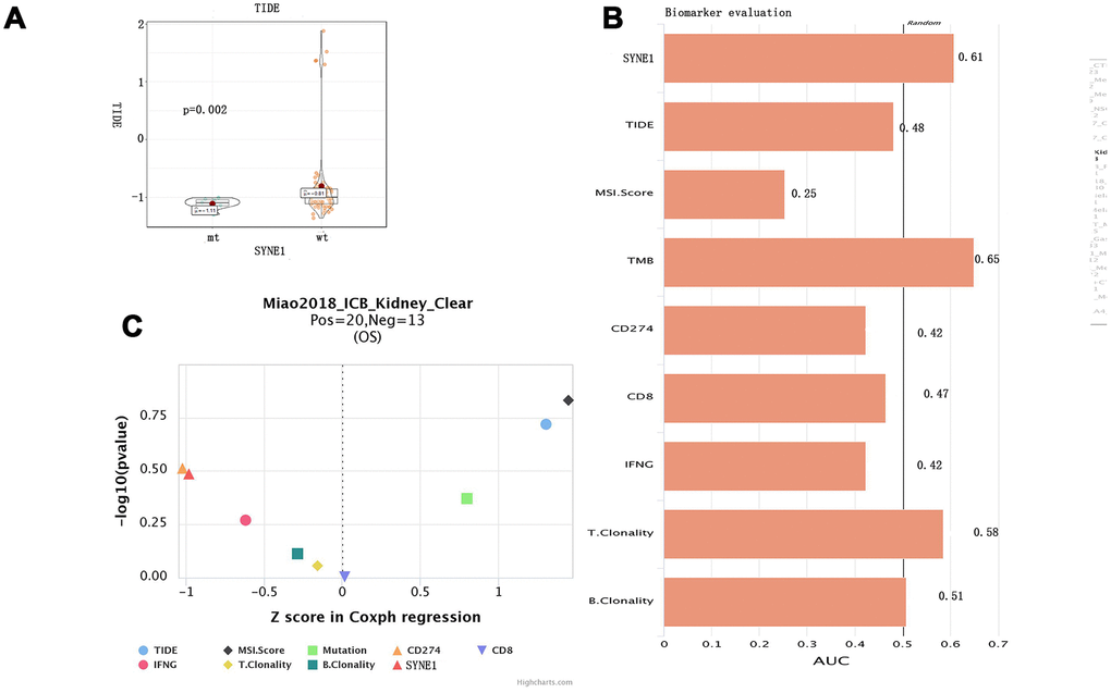 To evaluate the ability of SYNE1 mutation to served as a biomarker predictive of the clinical response to ICB therapy, we analyzed datasets from patients with stage 4 ccRCC using the TIDE algorithm. The results showed that the mt group was associated with lower TIDE scores, indicating a stronger response to ICB therapy (Figure 4A). To evaluate its utility as a biomarker, we compared SYNE1 mutation to other existing biomarkers. Bar plots showed that SYNE1 has good prediction accuracy (Figure 4B). Lastly, our results suggest that SYEN1 mutation may be an independent risk factor associated with prognosis for ICB therapy (Figure 4C).
