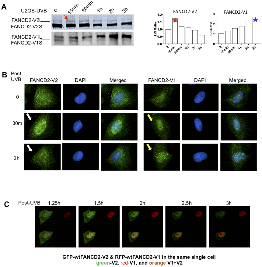For live imaging, U2OS cells were seeded on special glass base dishes and transfected with RFP-FANCD2V1 and GFP-FANCD2V2 for 12h, then treated with UVB at 25 J/m2. Cells were then observed with 10X60 lens on a Leica SP5 Confocal Microscope. Images were acquired every 15min for 4-6h and analyzed using Leica Application Suite X.