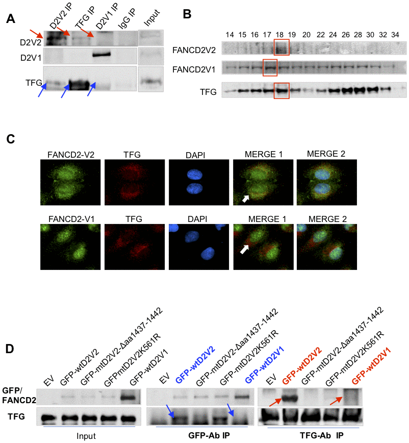 TFG specifically interacts with FANCD2-V2, but not FANCD2-V1