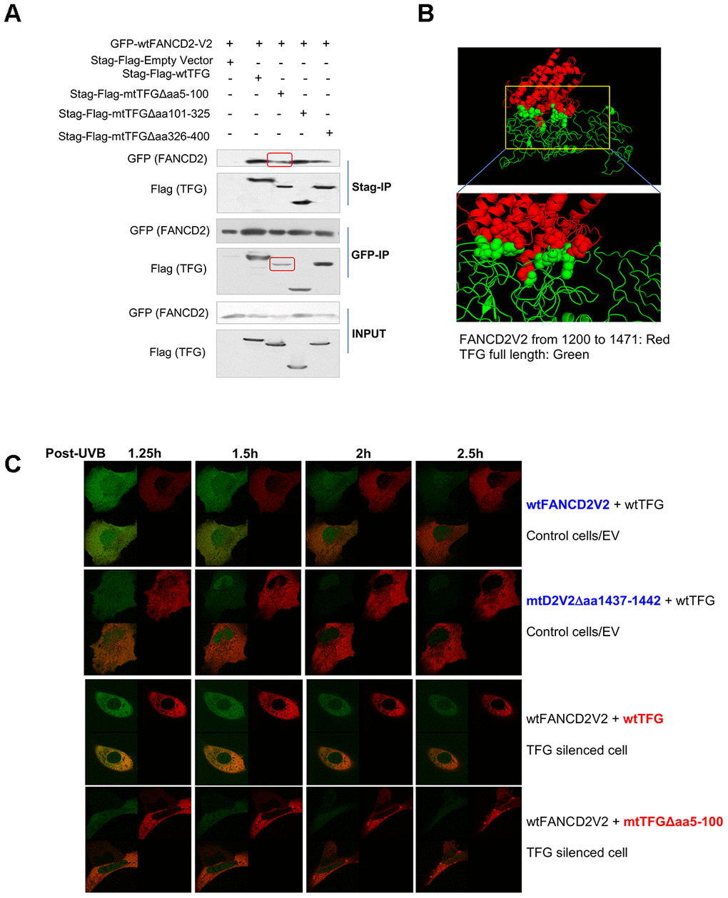 Next, we began to identify which part of TFG is responsible for interacting with FANCD2-V2. As outlined in Supplementary Figure 3A and 3B, TFG was dissected into three parts and corresponding deletion constructs were established and verified by sequencing. After transiently transfecting these different versions of TFG cDNA-containing plasmids in combination with wtFANCD2-V2 respectively into HEK293T cells, the reverse IP-WB was performed by using antibodies against tags, GFP and Stag-Flag respectively fused with FANCD2-V2 or TFG. We found that the interaction was reduced between FANCD2-V2 and a mutant TFG Δaa5-100 compared to other versions of TFG either deleted at aa101-325 or aa326-400 (Figure 3A). We also confirmed the interaction between FANCD2-V2 and TFG by molecular docking (Figure 3B). We utilized I-TASSER server [10] to generate the putative human protein model of TFG and FANCD2-V1 (1200-1441) and conducted the molecular docking between two proteins using Z-DOCK [11]. The predicted structure of human TFG (green), based on the PSCD-region of the cell wall protein pleuralin-1 (PDB: 2NBI_A) using I-TASSER, adapted well to that of partial FANCD2-V1 protein from 1200-1441 (red) (PDB: 3S4W_B). This separated region from AA40 to AA362 of TFG interacted with FANCD2-V1 (AA1281-1470) was described as spheres, consistent with our IP results (Figure 3A). Next, the in-vivo florescent studies were performed to further support the importance of the interaction relying on aa5-100 region of TFG or aa1437-1442 of FANCD2-V2 by showing FANCD2-V2’s focus formation (Figure 3C, Supplementary Videos 2–5). Particularly, live imaging on a single cell expressing a normal level of endogenous TFG, but co-transfected with GFP-wt or mtFANCD2-V2 along with RFP-wtTFG, the green focus duration (nuclear localization) of GFP-mtFANCD2-V2Δaa1437-1442 was substantially reduced compared to GFP-wtFANCD2-V2. In TFG-silenced cells co-transfected with RFP-wt or mtTFG along with GFP-wtFANCD2-V2, the green focus duration of GFP-wtFANCD2-V2 was also reduced in mtTFGΔaa5-100 transfected cells compared to cells transfected with RFP-wtTFG (Figure 3C and Supplementary Videos 2–5; Supplementary Figure 3C). Together, these live images demonstrate the functional importance of aa5-100 of TFG and aa1437-1442 of FANCD2-V2 for the prompt response of FANCD2-V2 to genotoxic stresses, thus the importance of TFG-regulated FANCD2-V2 in genome caring.