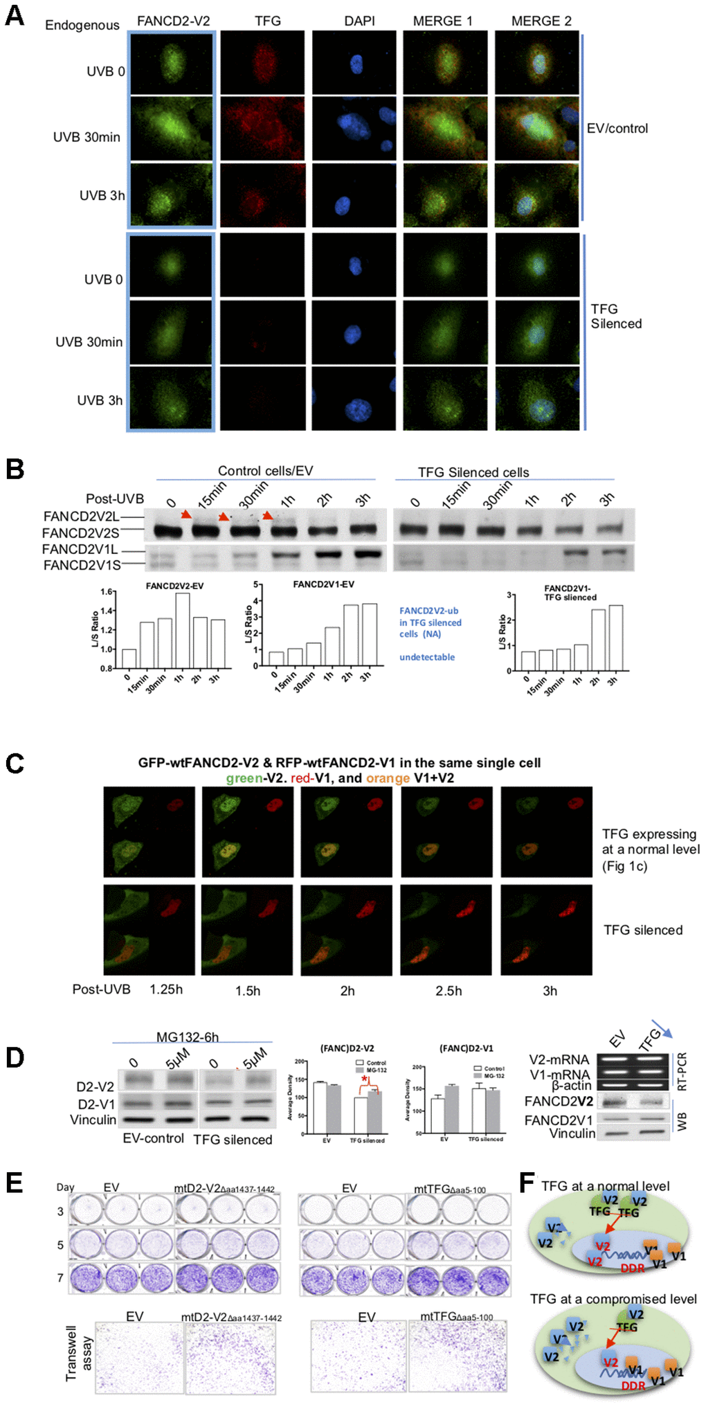 The association between TFG and FANCD2-V2 assures the timely response of FANCD2-V2 to DNA damage, which is attributed to TFG regulation of the steady-state level of FANCD2-V2 protein, but not FANCD2-V1