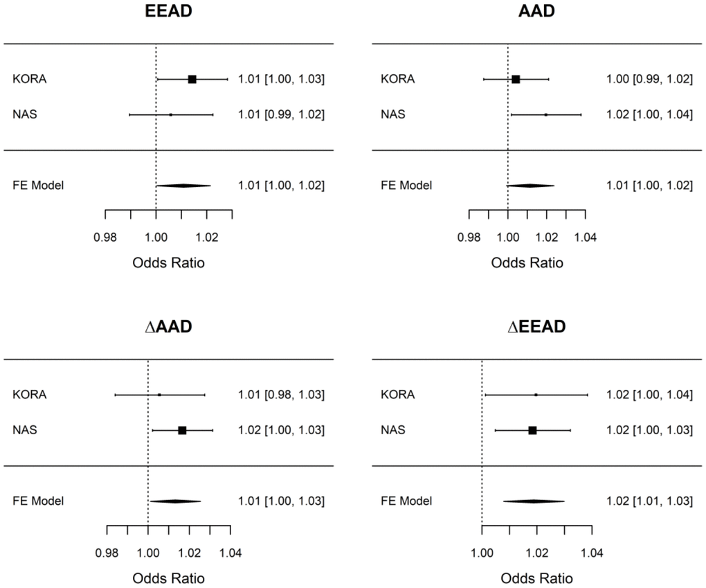Adjustment models for the analyses are given in Table 2 and described in the methods. Higher baseline EEAD was associated with higher odds of incident of COPD (odds ratio [OR] = 1.01 per 5-year higher EEAD; 95% confidence interval = 1.00 – 1.03) while AAD did not show an association with incident COPD (Table 3; Supplementary Table 2). There was a modest, negative correlation between the difference in AAD between baseline and follow-up (ΔAAD) and AAD as well as between the difference in EEAD between baseline and follow-up (ΔEEAD) and EEAD at baseline indicating that those with lower baseline AAD and EEAD had larger changes in these aging biomarkers over time (Supplementary Figure 1). Analyses of ΔAAD and ΔEEAD in KORA revealed stronger associations than baseline measures alone, and the overall pattern of associations for both ΔAAD and ΔEEAD was concordant with associations observed for AAD and EEAD, i.e. stronger associations for ΔEEAD than ΔAAD and a slight attenuation of the estimates with inclusion of additional confounders. ΔEEAD was associated with incident COPD (Table 3). Of the COPD associations with P < 0.05 in KORA, the ΔEEAD and COPD association replicated in NAS (Supplementary Table 3) with a nearly identical effect estimate and 95% confidence interval across the two studies and a smaller 95% confidence interval in the meta-analysis (OR = 1.02; 95% CI = 1.01-1.03; P = 7.1x10-4; Figure 1).