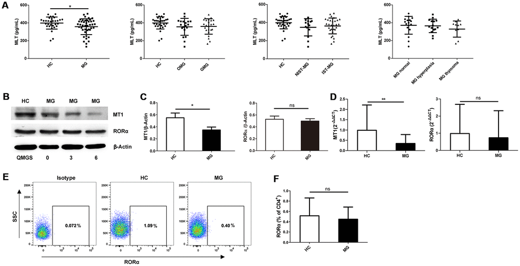 Serum melatonin levels were investigated in various subgroups. The results showed that serum melatonin levels were lower in MG patients than in healthy controls (HCs); however, the difference was not observed in different MG subgroups (Figure 1A). Expression of melatonin-related receptors was assessed by Western blot and quantitative RT-PCR assays. According to Western blot analysis, MT1 expression was lower in PBMCs from MG patients than in those from HCs, whereas no difference in retinoic acid-related orphan receptor (ROR)α expression was observed between these groups (Figure 1B, 1C). RT-PCR analysis showed that MT1 expression was significantly lower in PBMCs of MG patients than in those from HCs, with no statistically significant difference in RORα expression between MG patients and HCs (Figure 1D). Moreover, RORα expression was detected in peripheral CD4+ Th cells and was not significantly lower in cells from MG patients than in those from HCs (Figure 1E, 1F). Further correlation analysis indicated no correlation between melatonin receptor expression or serum melatonin levels and quantitative MG score (QMGS) (Table 1). Based on Spearman’s correlation analysis, serum melatonin levels did not correlate with the quantitative MG score (QMGS) (r = 0.216, P=0.311). Similarly, there was no association between melatonin receptor MT1 and RORα expression in PBMCs and QMGS (r =-0.232, P=0.658; r =0.166, P=0.753, respectively) or between RORα expression in CD4+ Th cells and QMGS (r = 0.295, P=0.306).