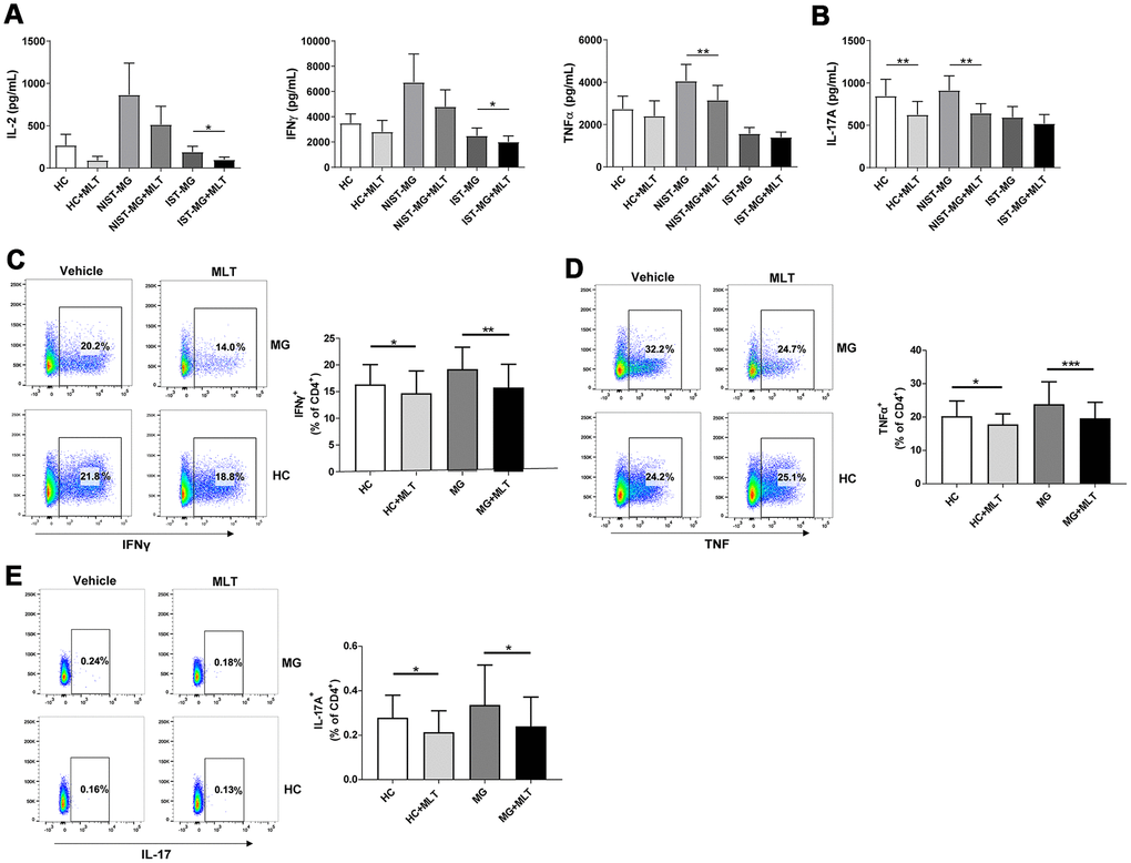 A previous study demonstrated that both Th1 and Th17 cells are involved in the pathogenesis of MG. In the present study, we found higher levels of Th1 cell hallmark cytokines (IL-2, IFNγ, and TNFα) in the nonimmunosuppressive therapy-MG (NIST-MG) group than in the HC and immunosuppressive therapy-MG (IST-MG) groups. Melatonin significantly decreased the levels of Th1 cell hallmark cytokines in the culture supernatants of PBMCs from MG patients (Figure 2A). In addition, levels of IL-17A, a Th17 cell cytokine, were decreased in both HCs and NIST-MG patients after melatonin treatment (Figure 2B). This finding suggests that melatonin can suppress proinflammatory cytokine production; however, it is difficult to assign the production of cytokines to a particular T cell subset with such an approach using PBMCs as the cell source. Therefore, we subsequently investigated the frequency of different T cell subgroups after melatonin treatment and found that the frequency of CD4+ T cells expressing either IFNγ or TNFα was lower in melatonin-treated PBMCs than in vehicle-treated PBMCs from either MG patients or HCs (Figure 2C, 2D). Additionally, the frequency of CD4+ T cells expressing IL-17A in PBMCs decreased after melatonin treatment (Figure 2E). Decreased proinflammatory cytokine levels and flow cytometry (FCM) results may provide some indication that melatonin can decrease Th1 and Th17 cell responses.