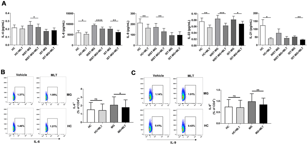In the NIST-MG group, levels of IL-4, a key Th2 cell cytokine, decreased slightly after melatonin treatment. Moreover, IL-6 levels were markedly reduced after melatonin treatment in PBMCs from both HCs and MG patients, with a particular decrease for the NIST-MG patient group. Moreover, the levels of IL-9, a representative Th9 cell cytokine, decreased in PBMCs from the HC and MG patient groups, especially in the NIST-MG group, after melatonin treatment. Levels of IL-22, a representative Th22 cell cytokine, were markedly lower after melatonin treatment in PBMCs from HCs and MG patients, especially in the NIST-MG group. IL-21 levels were also markedly decreased by melatonin treatment in HCs and IST-MG patients (Figure 3A). Next, we performed intracellular cytokine staining for two representative cytokines. The frequencies of CD4+ T cells expressing IL-6 (Figure 3B) or IL-9 (Figure 3C) were lower in melatonin-treated PBMCs from MG patients than in vehicle-treated cells.