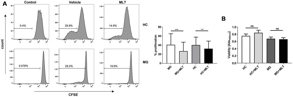 To evaluate whether the effect of melatonin on CD4+ T cells involves a change in cell viability, we analyzed potential differences in the proliferation and viability of melatonin- or vehicle-treated CD4+ T cells from both HCs and MG patients. Melatonin significantly inhibited the proliferation of CD4+ T cells from both groups (Figure 4A), though there was no difference in CD4+ T cell viability between the HC and MG groups (Figure 4B).