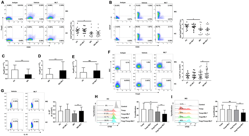 As depicted in Figure 5A, 5B, the frequency of Tregs, either CD4+CD25hiFoxP3+ or CD4+CD25hiCD127low cells, was lower in MG patients than in HCs. The number of Tregs in HCs and MG patients remained unchanged after melatonin treatment. However, RT-PCR demonstrated that FoxP3 expression was significantly downregulated in MG patients compared with HCs, indicating a functional defect in Tregs from the former group (Figure 5C). Furthermore, FoxP3 expression was upregulated in MG patients in response to melatonin treatment, and this response was not observed in HCs (Figure 5D, 5E). FCM analysis also revealed that melatonin increased FoxP3 expression in CD4+ T cells from MG patients but had little effect on those from HCs (Figure 5F). Expression of IL-10 was also increased in MG patients treated with melatonin treatment (Figure 5G). Tregs from HCs significantly inhibited the proliferation of Tresps (Figure 5H), but those from MG patients could not effectively inhibit Tresp proliferation, indicating a functional defect of Tregs in MG patients (Figure 5I). The suppressive effect of Tregs on phytohemagglutinin (PHA)-stimulated Tresp proliferation was stronger in the presence than in the absence of melatonin in both HCs and MG patients (Figure 5H, 5I).