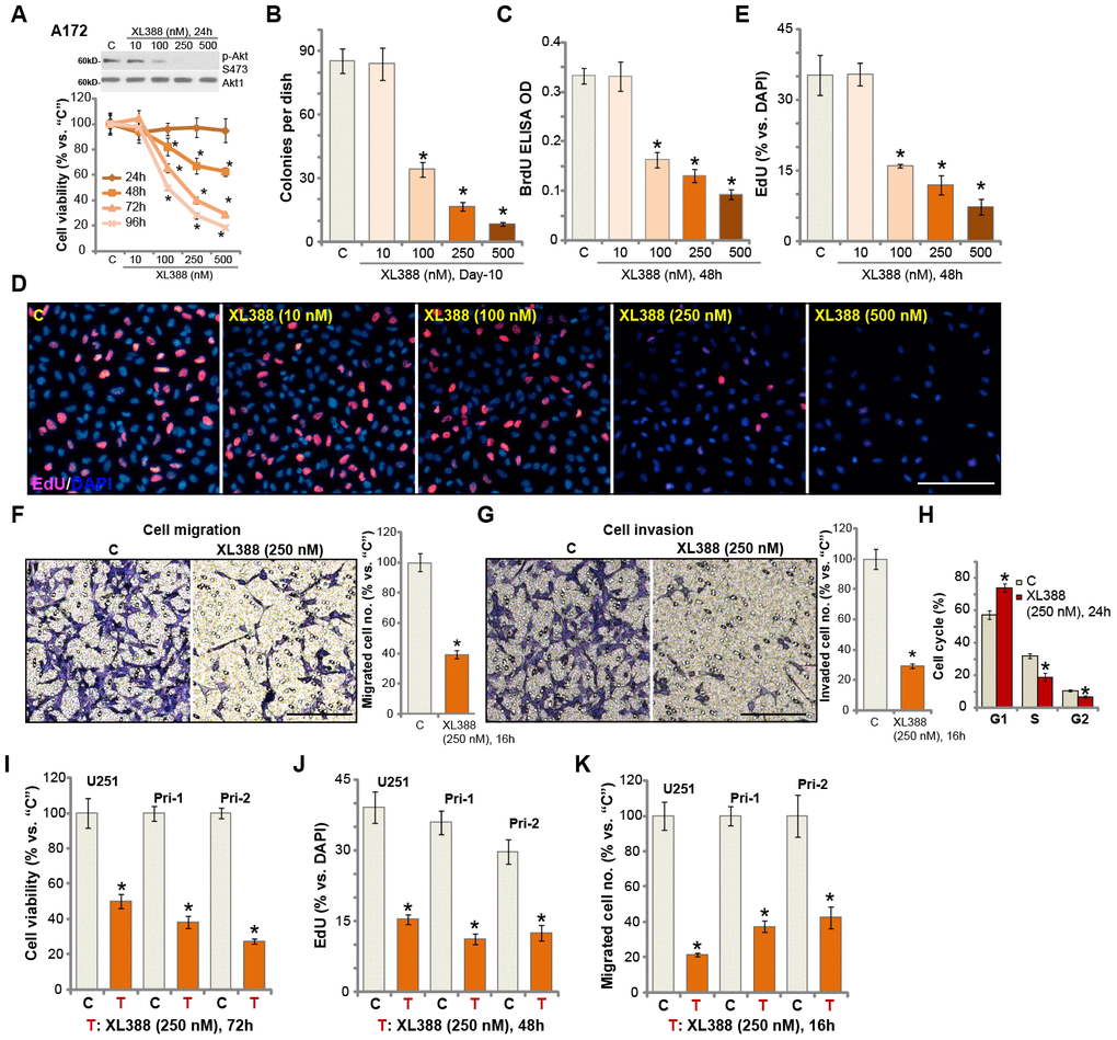 By applying “Transwell” and “Matrigel Transwell” assays, we show that XL388 (250 nM) inhibited A172 cell migration (Figure 1F) and invasion (Figure 1G) in vitro. The quantitative analysis demonstrated that it significantly reduced the number of migrated (Figure 1F) and invaded (Figure 1G) A172 cells. Analyzing cell cycle, by the propidium Iodide (PI)-FACS assay, show that XL388 (250 nM) treatment in A172 cells led to an increase in G1 phase cells, but decreases in S-/G2-phase cells (Figure 1H), indicating G1-S arrest in XL388-treated cells. For the cell migration/invasion and cell cycle analyses, cells were treated with XL388 (250 nM) for 24h or less, when no significant cytotoxicity or proliferation inhibition were detected (Figure 1A). Therefore, XL388 potently inhibited A172 cell viability, proliferation, migration, invasion and cell cycle progression. The potential effect of XL388 in other human glioma cells was studied as well. As described early, the primary human glioma cells, Pri-1/Pri-2 (derived from two different patients [12–14]), as well as the established U251 glioma cells, were cultured and treated with XL388 (250 nM). XL388 treatment resulted in significant inhibition of cell viability (CCK-8 OD, Figure 1I), proliferation (EdU incorporation, Figure 1J) and migration (“Transwell” assays, Figure 1K).