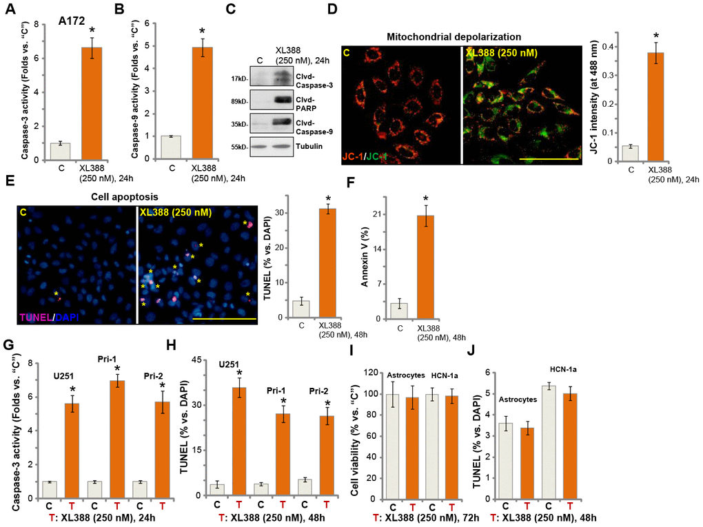 In human cancer cells, proliferation inhibition and cell cycle arrest could induce cell apoptosis. We therefore studied the potential effect of XL388 on glioma cell apoptosis. In A172 cells, the caspase-3 activity (Figure 2A) and the caspase-9 activity (Figure 2B) increased over 4-6 folds after XL388 treatment (250 nM, 24h). Furthermore, cleavages of caspase-3, caspase-9 and PARP were detected in XL388-treated A172 cells (Figure 2C). Following XL388 treatment, mitochondrial depolarization was detected in A172 cells, which was evidenced by accumulation of JC-1 green monomers (Figure 2D). Further studies demonstrated that TUNEL-positive cell nuclei ratio was significantly increased following XL388 treatment in A172 cells (Figure 2E). Cell apoptosis was further supported by a significant increase of Annexin V-positive staining in XL388-treated cells (Figure 2F). In U251 cells and Pri-1/Pri-2 primary glioma cells, XL388 similarly increased caspase-3 activity (Figure 2G) and induced apoptosis activation (TUNEL assays, Figure 2H). Significantly, XL388, at 250 nM, failed to inhibit cell viability (Figure 2I) and induce cell apoptosis (Figure 2J) in primary human astrocytes (“Astrocytes”) and HCN-1a neuronal cells. Both are non-cancerous cells [12, 13]. These results demonstrated that XL388 induced significant apoptosis activation in glioma cells.