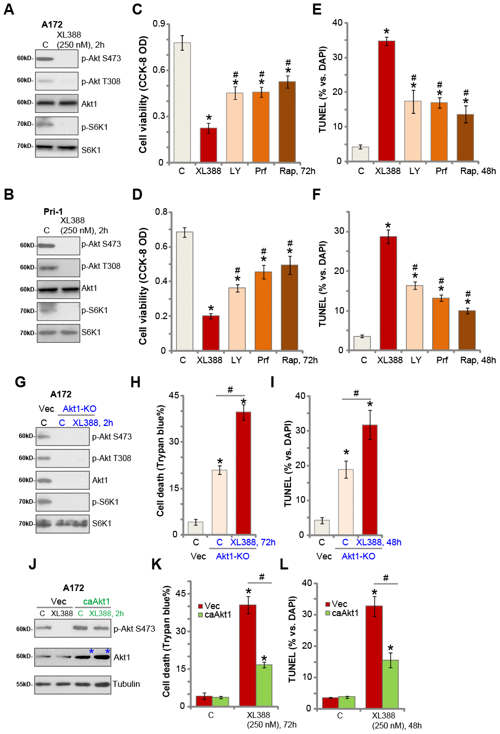 Next, a constitutive-active Akt1 (ca-Akt1, S473D, from Dr. Fang at Shanghai Jiao Tong University [30]) was transduced to A172 cells and stable cells were established with GFP sorting (Figure 3J, blue star). As shown, ca-Akt1 restored Akt activation even after XL388 treatment (250 nM, 2h) in A172 cells (Figure 3J). Importantly, ca-Akt1 only partially inhibited, but not reversed, XL388-induced A172 cell death (Figure 3K) and apoptosis (Figure 3L). Therefore, XL388 induces significant cytotoxicity in glioma cells through Akt-mTOR-dependent and -independent mechanisms.