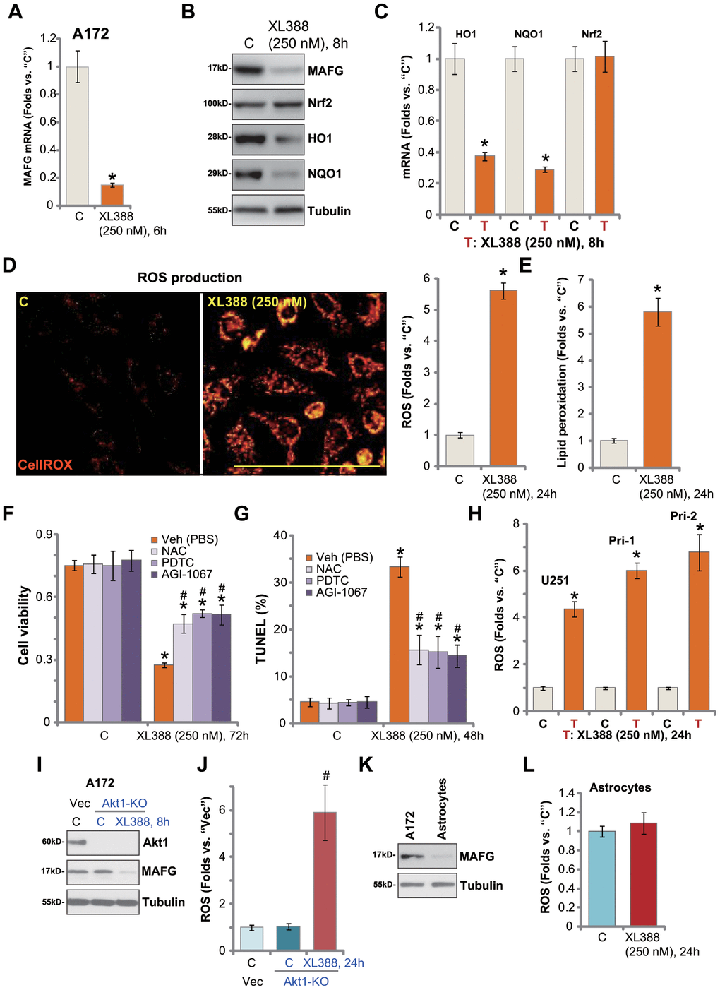 We showed that XL388 downregulated MAFG and inhibited Nrf2 signaling, causing significant ROS production and oxidative injury in glioma cells. Several antioxidants, including NAC, PDTC and AGI-1067, alleviated XL388-induced glioma cell death and apoptosis. Importantly, MAFG expression was unchanged in Akt-KO A172 cells. These results indicated that MAGF downregulation could be an unique action of XL388, which is responsible for the superior anti-glioma cell activity by this compound.