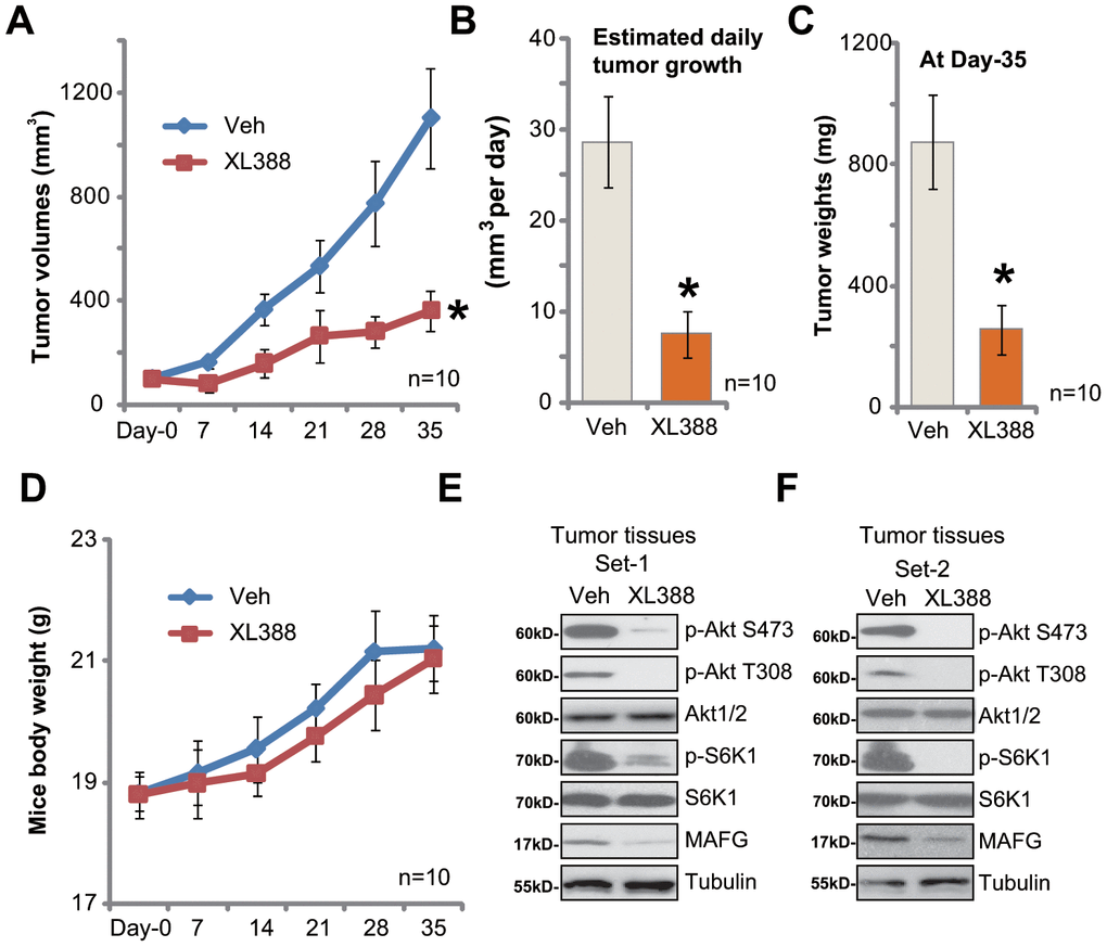 At treatment Day-7, two hours afterXL388 or vehicle administration, two xenografts of each group were isolated and tissue lysates were achieved. Results in Figure 5E and 5F confirmed that phosphorylation of Akt and S6K1 was largely inhibited in XL388-treated tumors, indicating Akt-mTORC1/2 inactivation. Furthermore, MAFG downregulation was detected (Figure 5E and 5F).