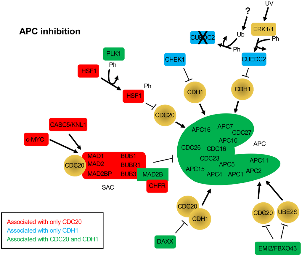 Several other proteins were identified in the CDC20 and CDH1 searches that function as APC inhibitors (CHEK1, CUEDC2, HSF1, DAXX, EMI1/FBXO5 and EMI2/FBXO43). CHEK1 depletion results in disruption of CDC20 and MAD2 localization to kinetochores and decreased CDC20 and MAD2 protein levels [83]. This suggests that CHEK1 is required for APC inhibition. A second study describes this further as it shows that CHEK1 inactivates APCCDH1 in the presence of replication stress by targeting CDH1 for degradation, thereby inhibiting APC activity [84]. CUEDC2 is an interesting protein that functions to inhibit APCCDH1, yet activate APCCDC20. In G1, CUEDC2 binds to and inhibits APCCDH1, thereby stabilizing Cyclin A and promoting G1-S transition [85]. This is blocked by UV irradiation. In the presence of UV, ERK1/2 phosphorylates CUEDC2, leading to ubiquitin and proteasome dependent degradation. The E3 responsible for CUEDC2 degradation has not yet been identified. Activation of APCCDC20 by CUEDC2 is discussed below. HSF1 functions in cancer by inhibiting the interaction of CDC20 with CDC27 and blocking APC activation [86]. The overproduction of HSF1 resulted in the accumulation of APC substrates, inhibited mitotic exit and generated aneuploidy. It was also found that HSF1 phosphorylation by PLK1 was required to bind CDC20 and inhibit APC activity [86]. There are 2 additional APC inhibitors called Early Mitotic Inhibitors (EMI) 1 and 2. EMI1 acts as both an inhibitor and an APCCDH1substrate [25, 26]. EMI1 levels are kept low during G1 by APCCDH1, and then high during S and G2 when APC activity is low. APC inactivation is triggered by CDK2/Cyclin E activity during G1, which coincides with increased EMI1 mRNA expression, which serves to maintain APC inhibition. EMI2, on the other hand, works by inhibiting the interaction of the APC with its E2 component UBE2S in unfertilized Xenopus eggs, thereby blocking unfertilized eggs in metaphase of meiosis II [87]. Upon fertilization, EMI2 is targeted for degradation by the SCFβ-TrCP complex. EMI2 also blocks APC activity by blocking the association of CDC20 with the APC [88]. Lastly, the DAXX protein is often observed to be overexpressed in prostate cancer cells. DAXX encodes APC recognition motifs called destruction boxes. DAXX interacts with both CDC20 and CDH1 via these motifs but does not appear to be a substrate [89]. This interaction is sufficient to disrupt APC function.