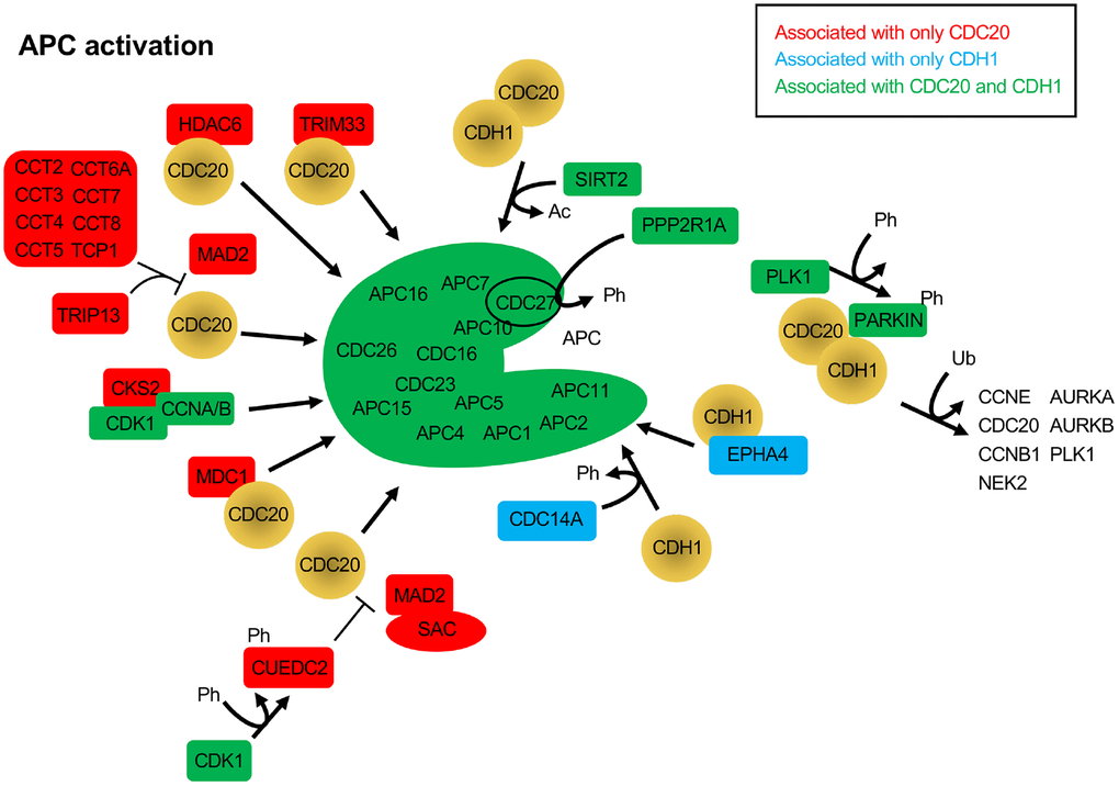 Subsequent BioGRID searches were performed for CDC20 and CDH1 separately to specifically identify common and unique interactors for the 2 coactivators. One hundred and eighty one and 175 interaction nodes were identified for CDH1 and CDC20, respectively, resulting in 819 edges for CDH1, and 919 edges for CDC20. Nodes define proteins interacting with CDC20 or CDH1, while an edge is a line that connects any 2 proteins. A protein node may have more that 1 edge, resulting in more edges than nodes. Thirteen APC subunits were identified by both the CDC20 and the CDH1 searches. Each protein node was searched on PubMed to identify overlaps with APC function. Any protein that did not overlap with the APC on PubMed was not followed further. Physical interactions identified by BioGRID can be part of global screens where individual hits are not discussed in manuscripts, so are not picked up in PubMed searches. So, while these proteins likely physically associate with CDC20 and/or CDH1, not enough information is available to discern the mechanism of association. Further, many proteins may not be direct interactors, but interact through intermediaries defined by complexes. For this analysis we focused on proteins involved in APC inhibition (Figure 2), APC activation (Figure 3) or are potential APC substrates (Figure 4).