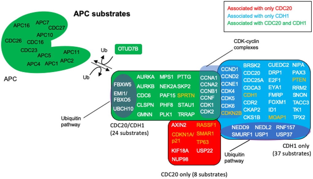 All APC substrates identified in Figure 4 are individually implicated in tumor development, and many are frequently found to be overexpressed in a variety of cancers (60 of 69 proteins in Figure 4) [47, 49, 198, 199]. These discrete substrates have typically been considered in isolation, rather than as a population of APC substrates as a whole. As detailed below, the combined effect on cell biology with the accumulated overabundances of multiple APC targets includes loss of cell cycle regulation, introduction of promiscuous cycle progression, impaired apoptosis and increased genomic instability. These are classic features of cancer.