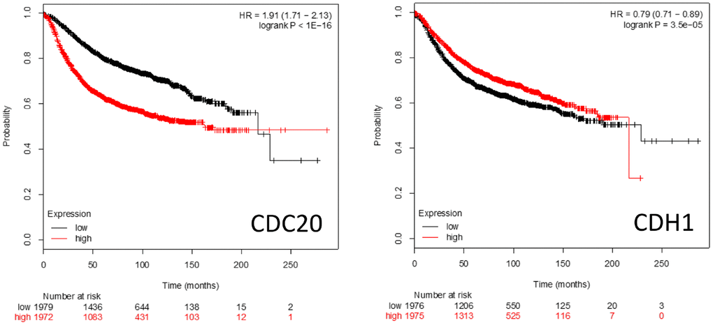 Kaplan-Meier survival plots (https://kmplot.com/analysis/) of patient survival rates when either CDC20 or CDH1 are over- or underexpressed is shown in Figure 5. High level CDC20 expression is associated with poor patient survival rates, whereas high level CDH1 expression is associated with a slightly better survival rate. This is consistent with the literature suggesting that CDC20 and CDH1 interact with a distinct cohort of proteins and pathways (Figures 1–4) and have distinct roles in cell homeostasis when associated with the APC.