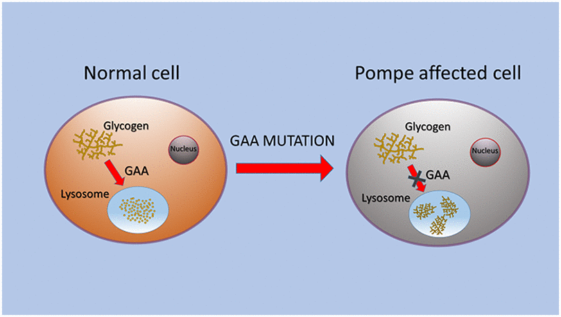 Lysosomal storage disorders (LSDs) are a subgroup of inherited diseases caused by inborn errors of metabolism [1, 2]. In LSDs, lysosomal enzymes are impaired and their functional deficit leads to substrate storage [3]. The catabolic role of lysosomes consists in breaking down and recycling of several substrates such as sphingolipids, glycogen, glycosaminoglycans, and proteins [4]. Different acidic hydrolases, such as glycosidases, lipases, sulfatases, phosphatases, peptidases and nucleases are involved in the lysosomal catabolic processes [5]. Pompe disease (OMIM # 232300) or glycogenosis type II or acid maltase deficiency is a rare, chronic and muscle-weakening, often fatal neuromuscular disease [6–8]. PD was described, for the first time, in 1932 by the Dutch physician Joanne Pompe in a 7-month-old child with general muscle weakness, who died from idiopathic cardiac hypertrophy. The association of the disease’s symptoms with the glycogen storage in all tissues was the first crucial observation [9]. In 1954 this disorder was classified as type II glycogen storage disease, but the correlation between this disorder, lysosomal storage, and enzymatic deficit was made in 1963 when the biochemist Hers discovered acid maltase [10]. This enzyme hydrolyses the glycogen into glucose at acid pH. In the same period, a deficit of acid maltase and a storage of glycogen in lysosomes were observed in PD patients; thus PD became the first disease classified as LSDs, which is a group of 50 disorders [11].