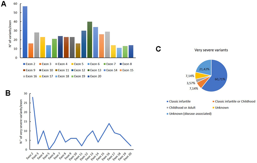 Figure 2B shows the distribution of very severe variants for each exon. These mutations are mainly reported in exon 2, in which the 49 % of all variants were associated with the very severe phenotype. Moreover, these variants are principally associated with a classical infantile form of PD, as shown in Figure 2C.