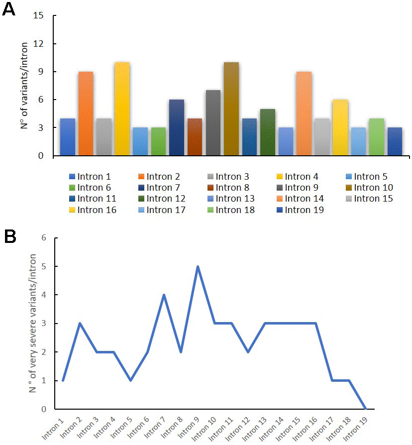 In Figure 3A, we reported the variant distribution for each intron: as shown in the histogram, several variants are described in introns 2, 4, 10 and 14. Figure 3B shows the distribution of very severe variants for each intron. These mutations are mainly found in intron 9, in which all the reported variants are considered very severe (Figure 3B).