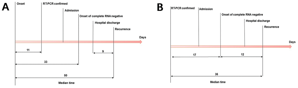 In our study, the median duration of viral shedding for patients with positive SARS-CoV-2 RNA recurrence was 33 days from the onset of illness to complete RNA negative status. However, the median duration from illness onset to SARS-CoV-2 RNA reversion was 50 days. Previous studies have reported on duration of viral shedding. Zhou F et al. [6] reported a 20 day median duration of viral shedding in survivors and the longest observed duration was 37 days. Furthermore, Zhou B et al. [18] reported that the median duration of viral shedding was 31 days from illness onset in severe COVID-19 patients. Xu K et al. [19] further showed that 3 out of 4 COVID-19 patients had viral RNA clearance within 21 days of illness onset, and male gender, older age, hypertension, delayed hospital admission, severe illness upon admission, invasive mechanical ventilation and corticosteroid treatment were risk factors for prolonged viral RNA clearance. Our findings underscore the importance of a prolonged treatment or isolation for patients at increased risk of recurrent SARS-CoV-2 RNA positivity.