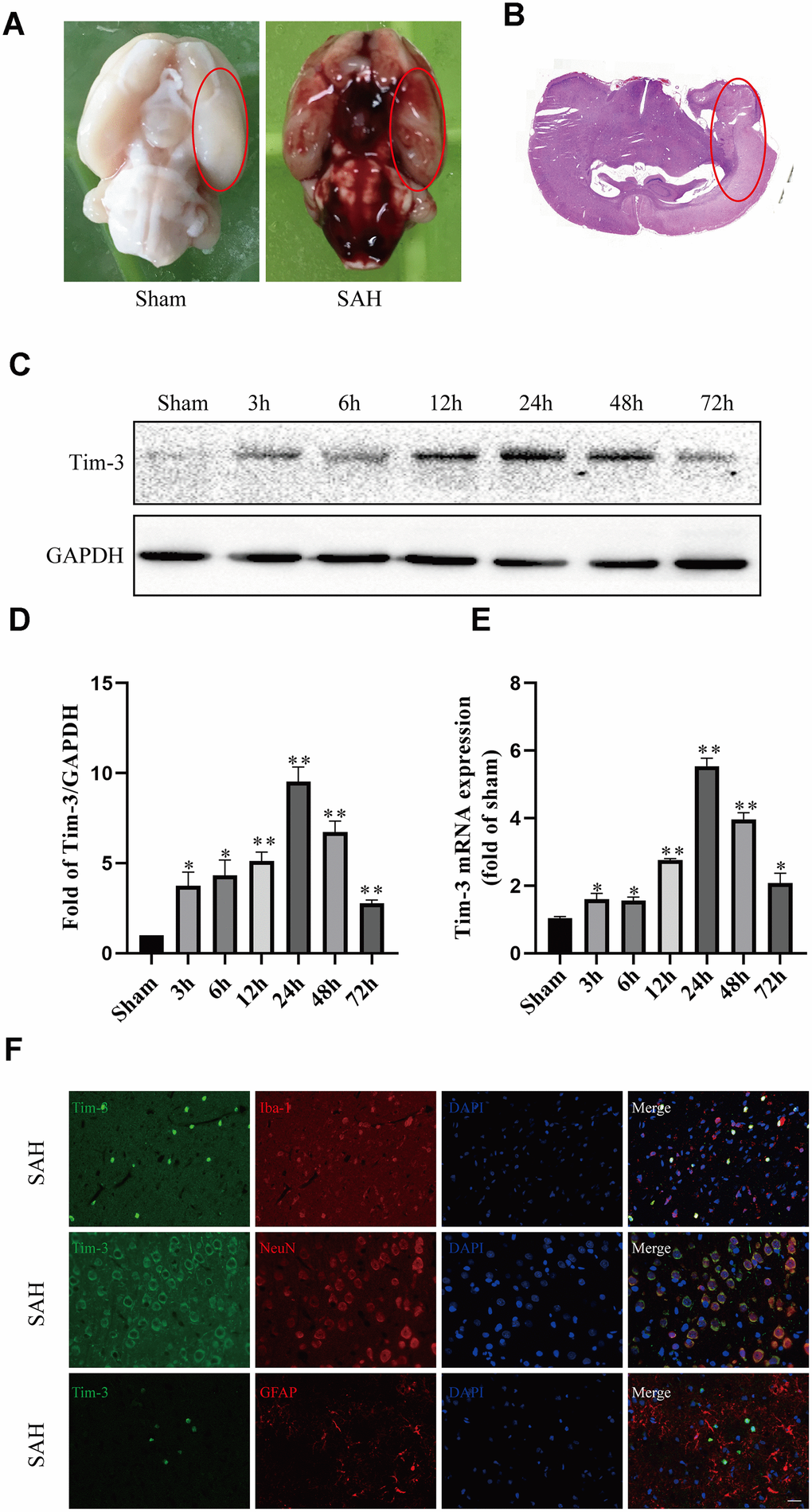 Forty-eight male rats were randomly divided into seven groups; sham and SAH 3, 6, 12, 24, 48, and 72 h post operation. The ipsilateral cerebral cortex of six rats from each group was collected for quantitative real-time polymerase chain reaction (RT-qPCR) and western blotting. Additionally, the cellular location of Tim-3 was evaluated by double immunofluorescence staining at 24 h post-SAH.