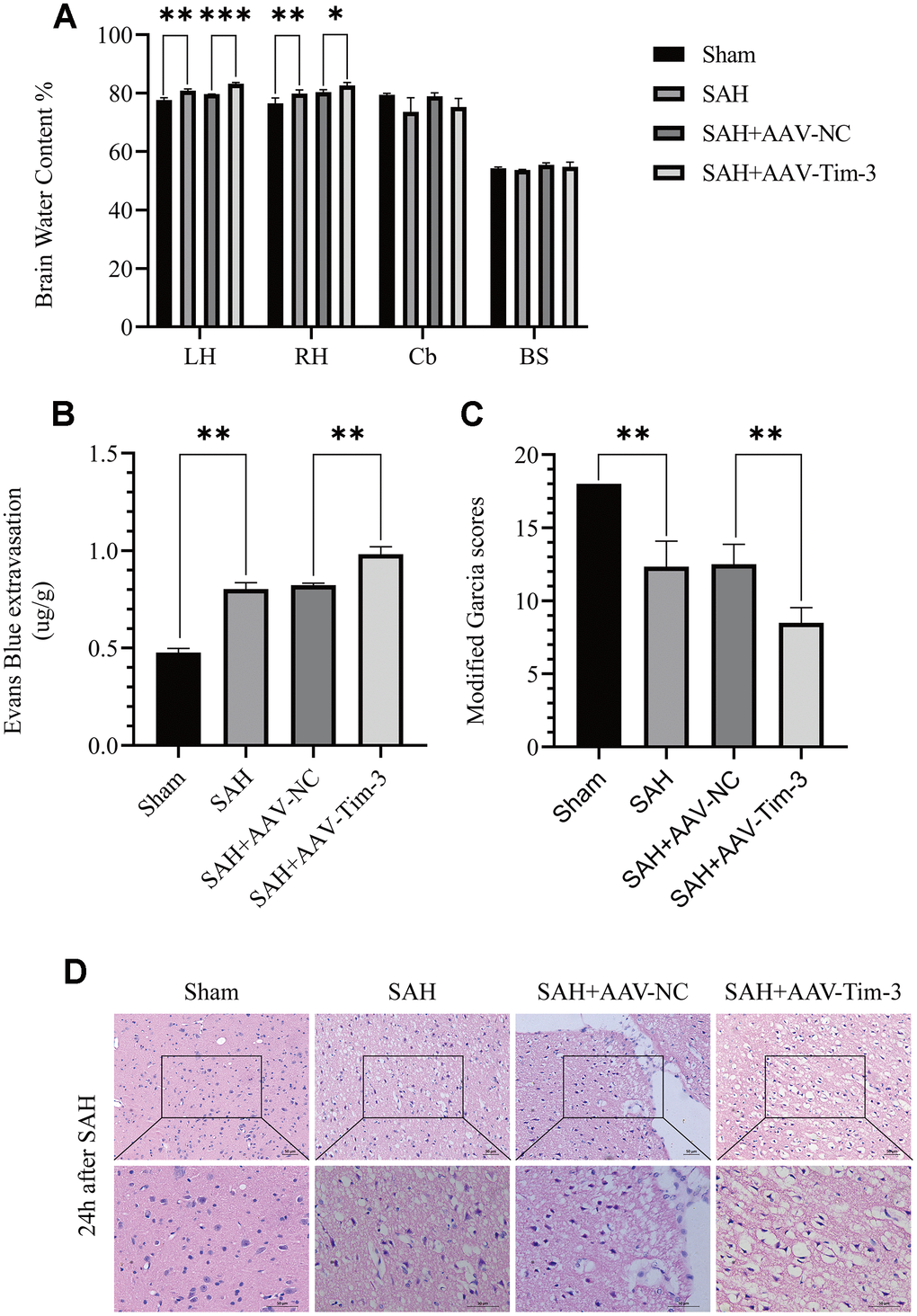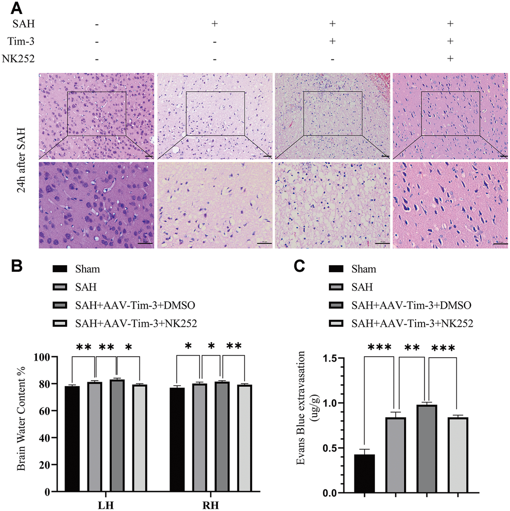 Lateral ventricle injection of AAV-Tim-3 enhanced EBI, aggravated brain edema, disrupted the BBB, and increased neurological deficits at 24 h after SAH