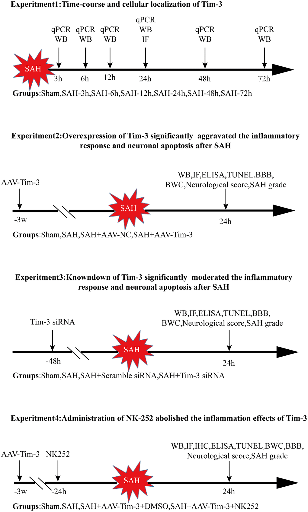 As previously reported, both clinical and experimental results of SAH showed that the inflammatory response induces EBI leading to BBB leakage, brain edema, neurocyte death, and neurological dysfunction. In addition, patients with elevated inflammation had poorer clinical outcomes. However, the definitive molecular mechanism of the pathological process is still not fully understood. Here, we conducted a preliminary study on the potential role of Tim-3, a novel immunomodulatory molecule, in SAH.