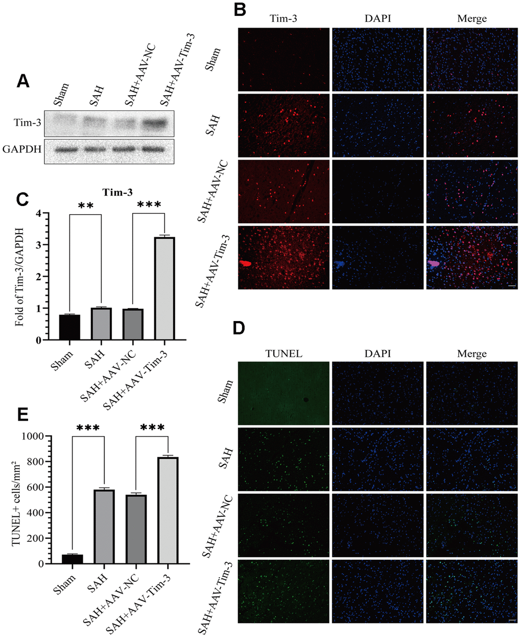 Lateral intraventricular injection of AAV-Tim3 was performed 3 weeks prior to SAH, and measured 24 h after SAH. Western blotting analysis showed that Tim-3 was noticeably increased after SAH (Figure 2A, 2B), which was verified by immunofluorescence staining (Figure 2C). To further investigate the effects of AAV-Tim-3 treatment on EBI after SAH, TUNEL staining was performed to estimated neurocyte apoptosis. At 24 h after SAH, TUNEL staining revealed that SAH induced a large amount of TUNEL-positive neurocyte in the cortical region of the ipsilateral hemisphere. Administration of AAV-Tim-3 significantly increased the number of TUNEL-positive neurocyte compared with the SAH+AAV-NC group. Furthermore, there was no significant difference between the SAH and SAH + AAV-NC groups (Figure 2D, 2E).