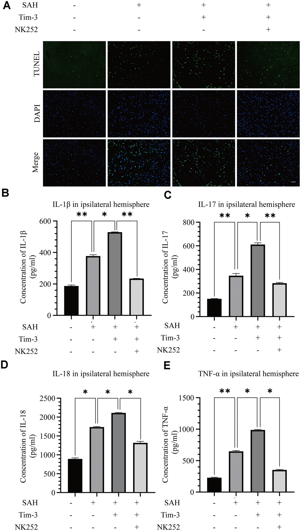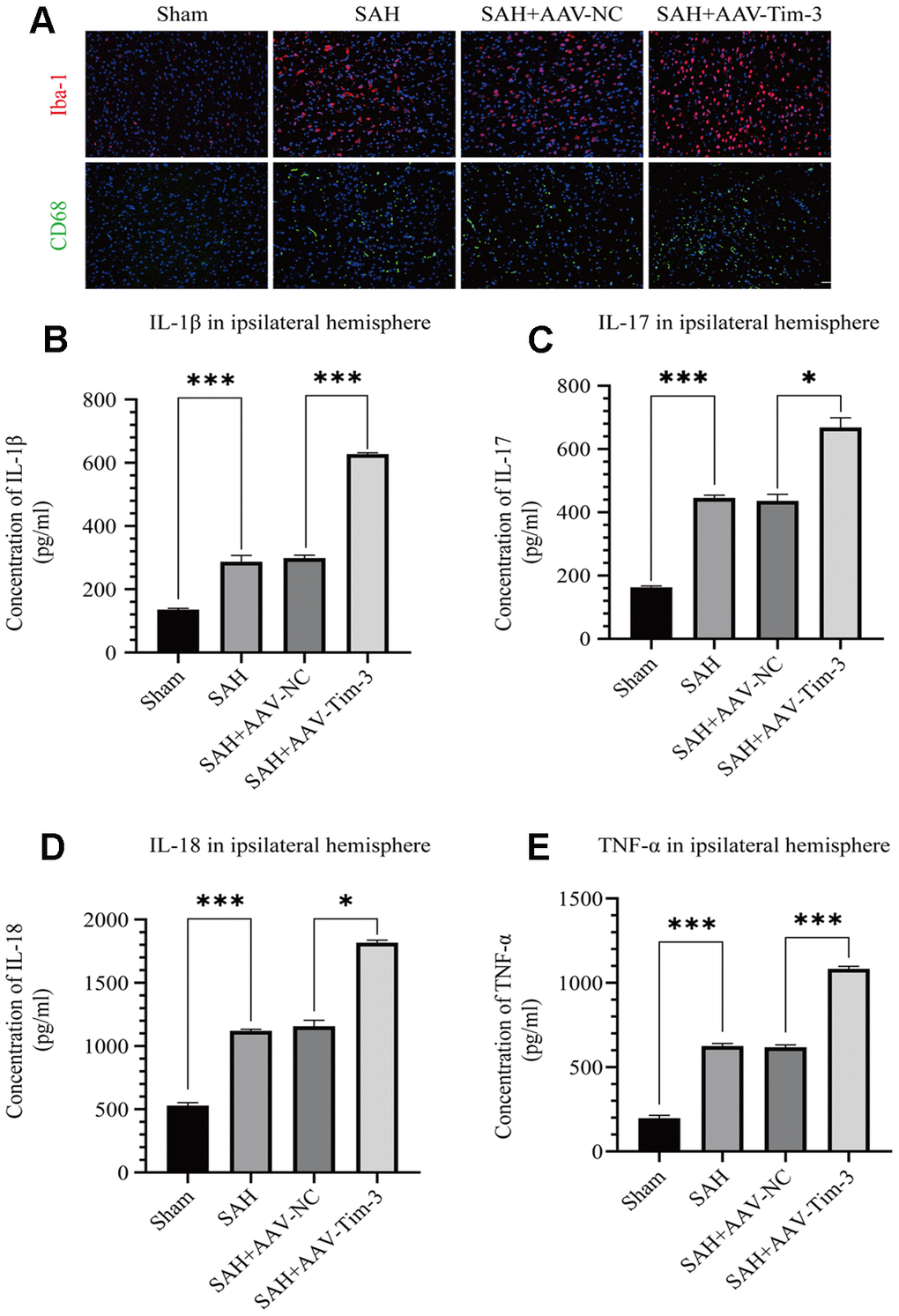 Activated microglia are an important source of pro-inflammatory cytokines in the brain. SAH insults significantly increased the expression of Iba-1 when compared with expression in the sham group. Furthermore, with AAV-Tim-3 treatment, Iba-1 and CD68 expression were markedly higher than those in the SAH groups, as revealed by immunofluorescence staining (Figure 4A). To further ascertain the effects of AAV-Tim-3 in downstream inflammatory cytokines release, we measured the release levels of several inflammatory factors in the ipsilateral hemisphere at 24 h post-SAH. Administration of AAV-Tim-3 significantly increased the levels of the proinflammatory cytokines, IL-1β, IL-17, IL-18, and TNF-α compared with the SAH+AAV-NC groups (Figure 4B–4E). In addition, there was no significant difference in brain edema or neurological score between the 24 h post-SAH groups and the SAH+AV-NC groups.